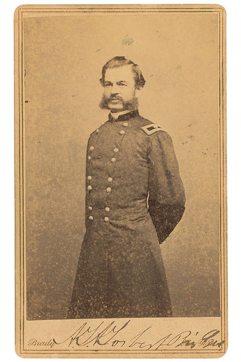 Union general (1833–1880) who commanded a cavalry division under Philip Sheridan. Original 2.25 x 4 carte-de-visite three-quarter-length portrait of Torbert in uniform, signed in the lower border in black ink, “A. T. A. Torbert, Brig. Gnl.” Published by Brady’s National Photographic Portrait Galleries of Washington. Overall speckling to image, otherwise fine condition.