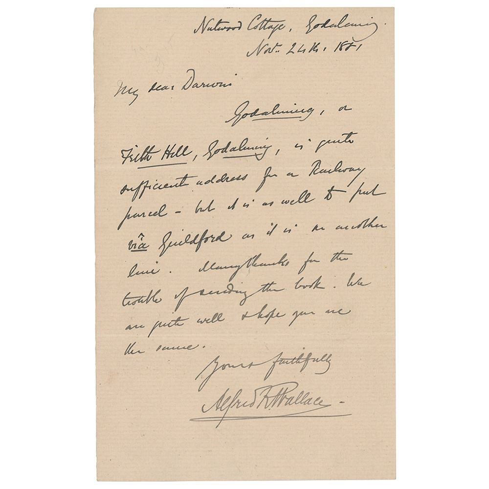 British naturalist, explorer, and biologist (1823–1913) best known for proposing a theory of natural selection which prompted Charles Darwin to publish his own. ALS signed “Alfred R. Wallace,†one page, 4.5 x 7, November 24, 1881. Handwritten letter to Charles Darwin, "My dear Darwin," in full: "Godalming, or Frith Hill, Godalming, is quite sufficient address for a Railway parcel—but it is as well to put via Guildford as it is on another line. Many thanks for the trouble of sending the book. We are quite well & hope you are the same." In fine condition.