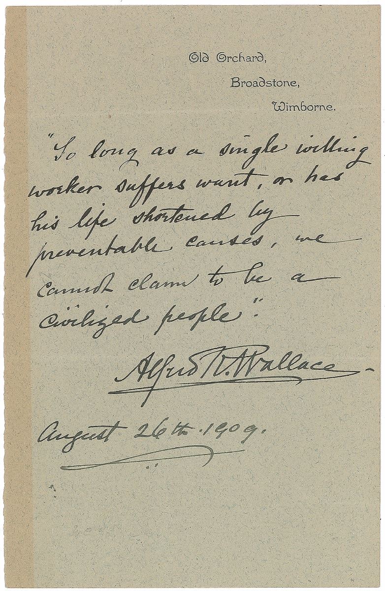 British naturalist, explorer, geographer, anthropologist, and biologist (1823–1913) who independently conceived the theory of evolution by natural selection. AQS on a gray sheet of Old Orchard stationery, signed “Alfred R. Wallace, August 26th, 1909.” Wallace writes, in full: “So long as a single willing worker suffers want, or has his life shortened by preventable causes, we cannot claim to be a civilized people.” In fine condition, with toning along the left edge barely impinging on the writing.