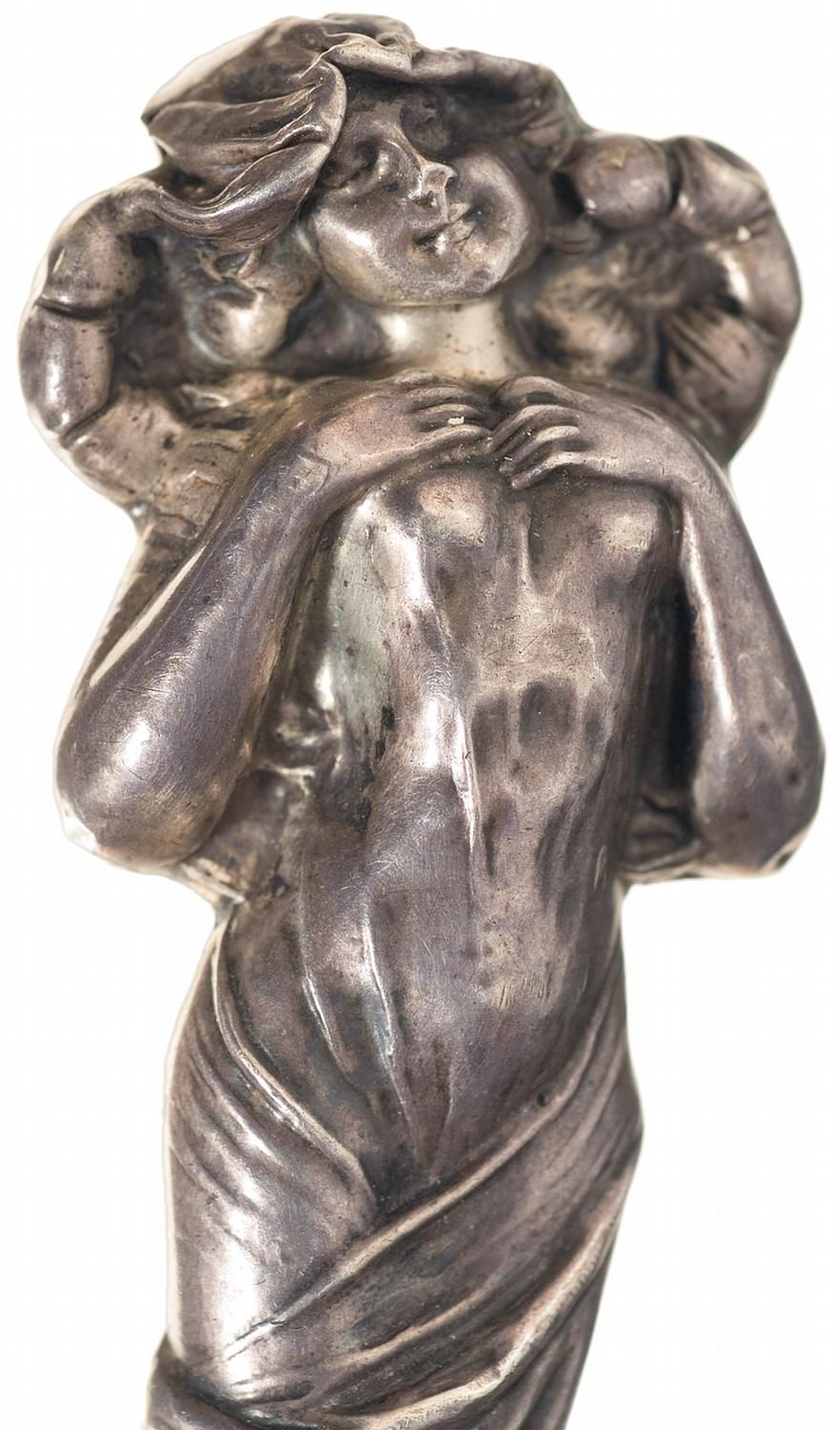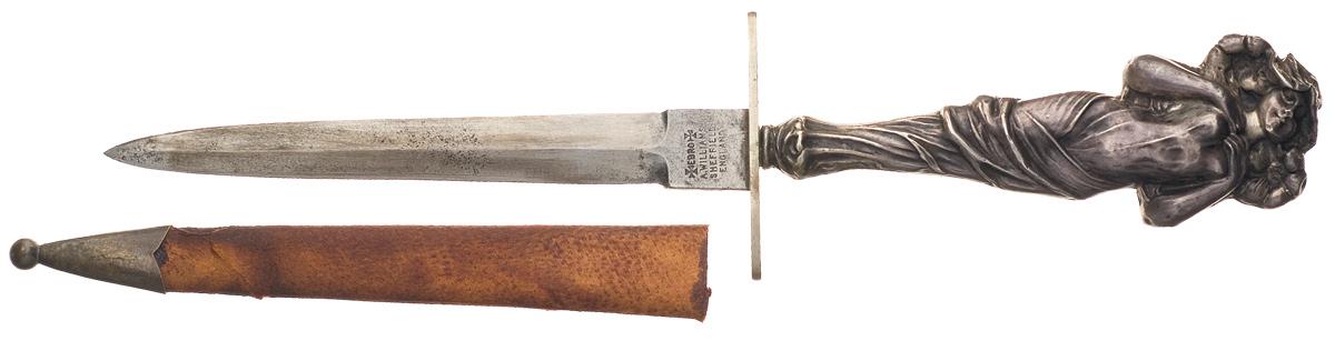The blade is 4" long and is marked "EBRO" flanked by Maltese crosses over "A. WILLIAMS / SHEFFIELD / ENGLAND". Silver oval guard. The scantily clothed woman figure handle is sterling silver. OAL: 7 3/4". Complete with a leather sheath with silver tip.