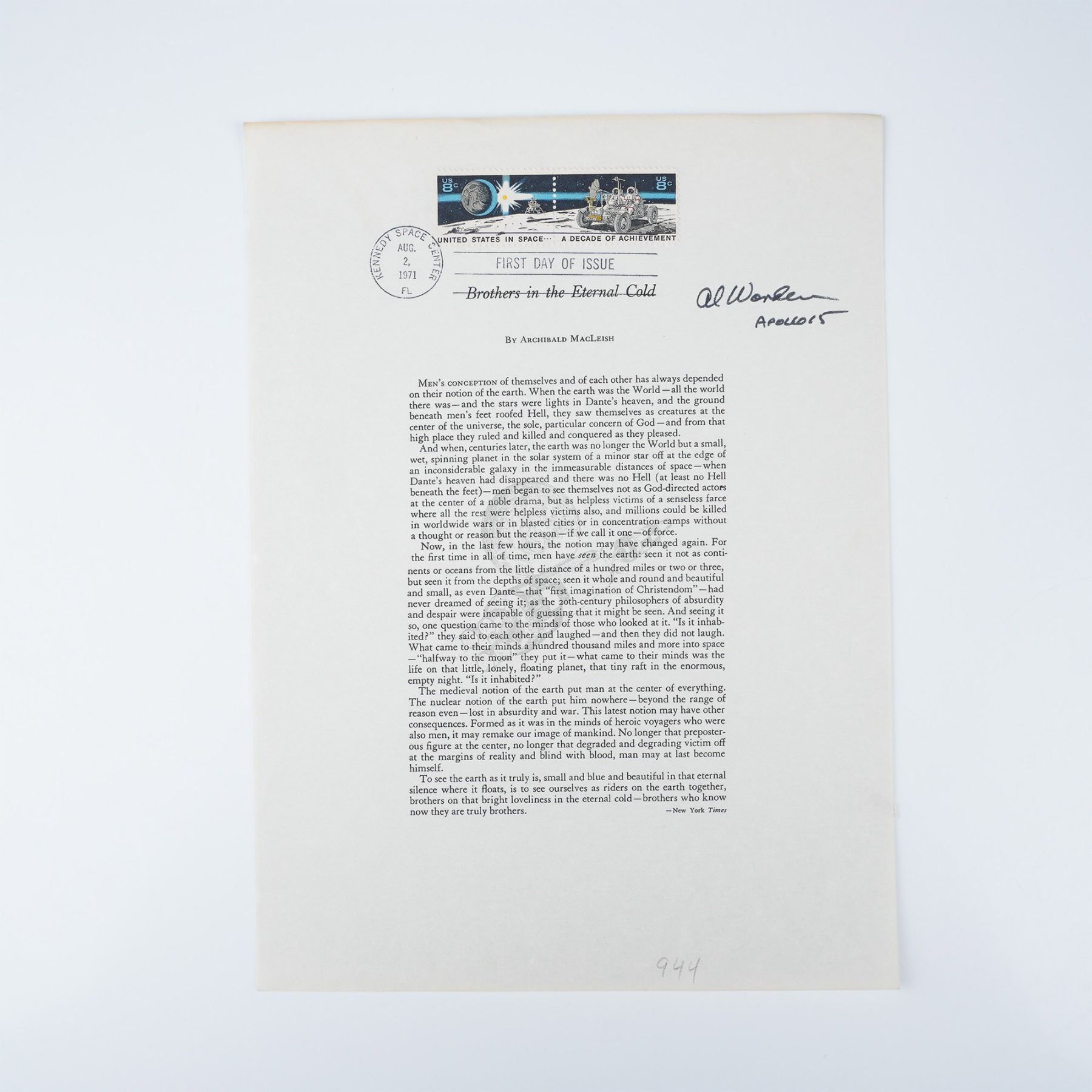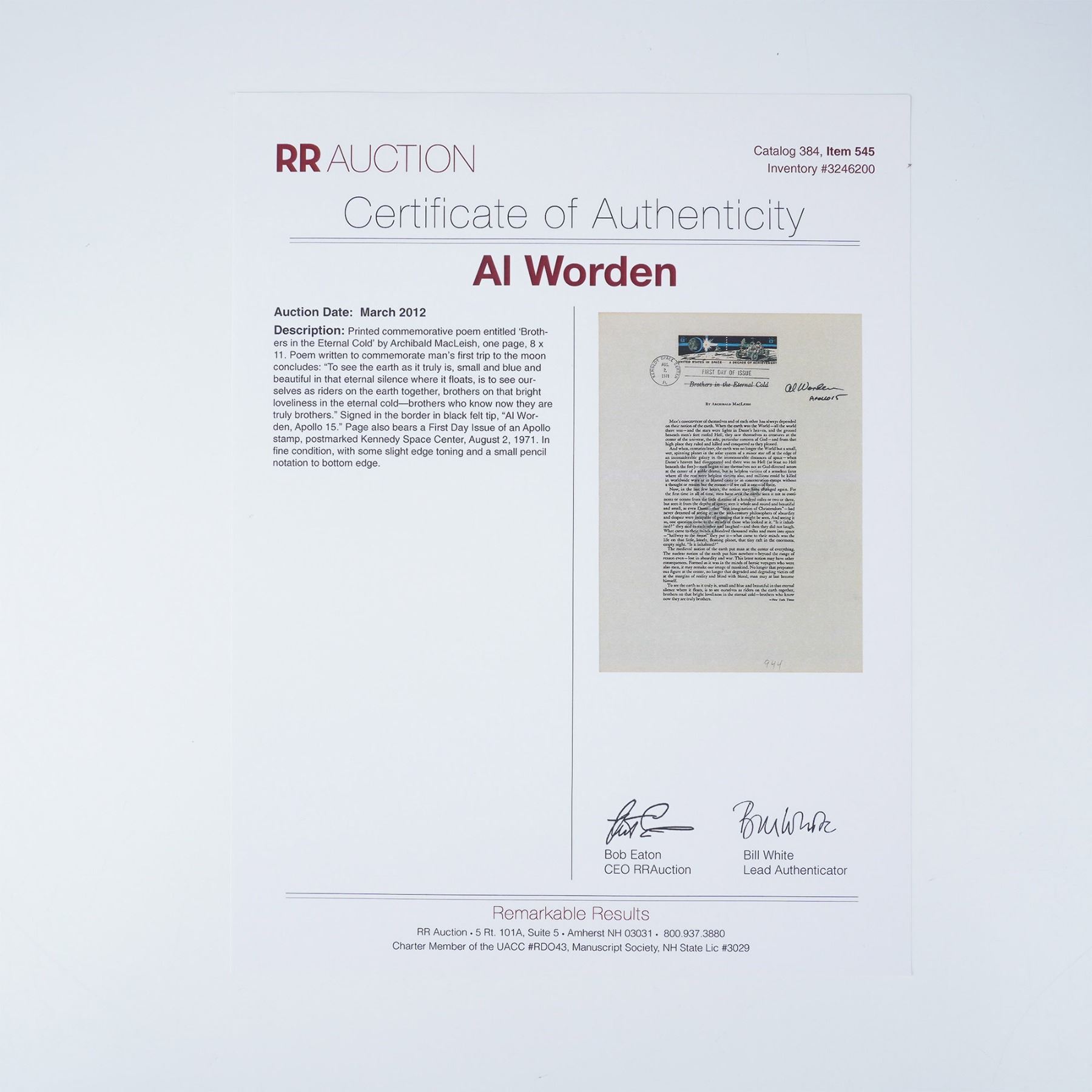A printed commemorative poem titled "Brothers In The Eternal Cold" by Archibald MacLeish, created to honor humanity's first journey to the Moon during the Apollo 8 mission in 1968. The poem reflects on the perspective of astronauts observing Earth from space-a small, fragile world surrounded by the vastness of the universe. The print is autographed by Apollo 15 astronaut Alfred Worden in black felt tip, and it features the First Day Issue of an Apollo stamp, postmarked from Kennedy Space Center on August 2, 1971. Alfred Worden (1932-2020) was a NASA astronaut and the Command Module Pilot for Apollo 15, the fourth manned mission to land on the Moon. While his fellow astronauts, David Scott and James Irwin, explored the lunar surface, Worden remained in lunar orbit aboard the command module Endeavour. Worden's contributions to the Apollo program were pivotal, as he helped to execute critical scientific experiments and conduct orbital observations of the Moon's surface. Worden's autograph adds tremendous value to this historic piece. This lot includes a RR Auction Certificate of Authenticity, verifying the signature's authenticity.