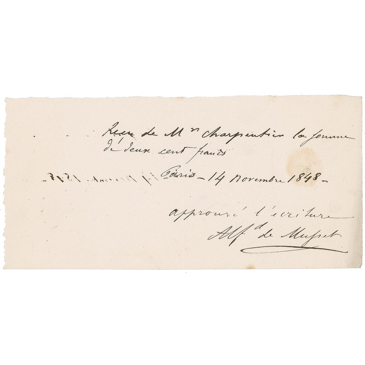 French Romantic poet and playwright (1810–1857) remembered for his poetry. Manuscript DS, in French, signed “Alfd de Musset,” one page, 7.75 x 3.75, November 14, 1848. Receipt for 200 francs received from his publisher, Monsieur Charpentier. In very good condition, with three vertical folds, on passing near signature, circular spot of toning, multiple tack holes to left side, and some light mirroring of text.