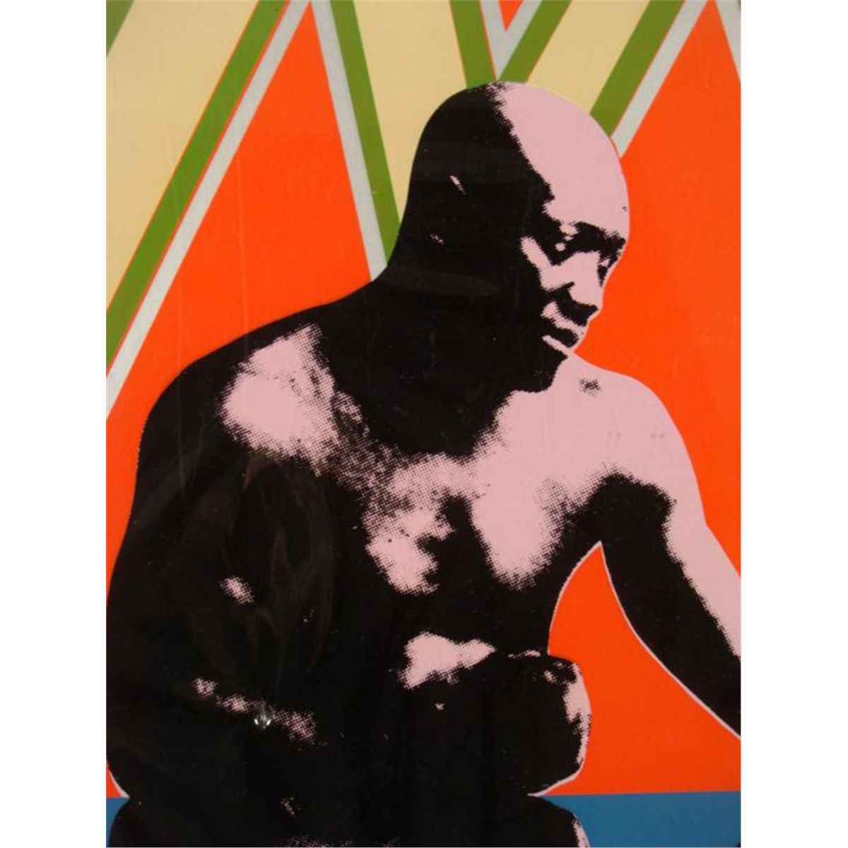 Here is boxing champion Jack Johnson in the design of a big playing card, in a Pop Sport Art style. * Artist: Alfred de Simone Signature: In pencil, lower right Title: "Champion" Jack Johnson Edition: 8/20 Medium: print on paper Sheet size: 22 x 28 inches Condition: Very good