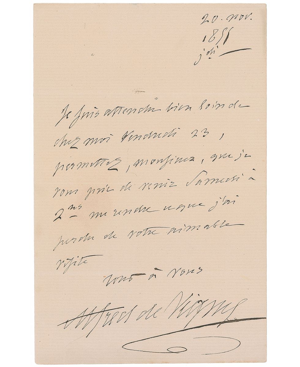 French poet, playwright, and novelist (1797–1863). ALS in French, one page, 5.25 x 8.25, November 20, 1855. Letter to a gentleman. In part (translated): “I will be far away from home on Friday, sir, I beg you to come Saturday at 2 o’clock.” In fine condition.