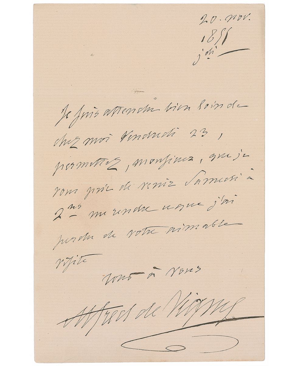French poet, playwright, and novelist (1797–1863). ALS in French, one page, 5.25 x 8.25, November 20, 1855. Letter to a gentleman, in part (translated): “I will be far away from home on Friday, sir, I beg you to come Saturday at 2 o’clock.” In fine condition.