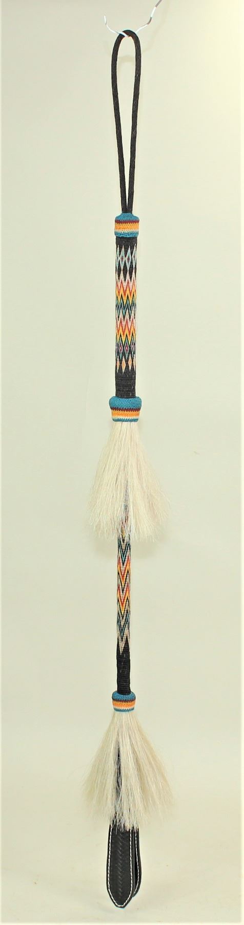 An eye dazzling hitched horsehair quirt, not marked, but done with exceptional quality and in a classic style and vivid colors of Alfredo Campos. With wonderful appeal and condition.