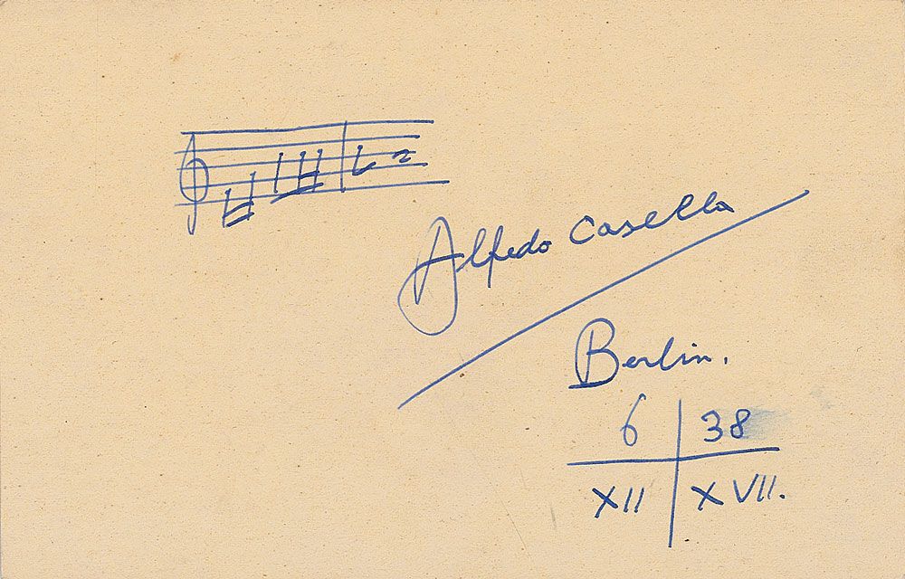 Italian composer of modernist tendencies (1883–1947) perhaps best known for his retrospective works, ‘Scarlattiana’ and ‘Paganiniani.’ AMQS on an off-white 5.5 x 3.5 card. Casella pens two bars of music, signed below and dated Berlin, 1938. In fine condition, with light overall toning and a slight brush to the date.