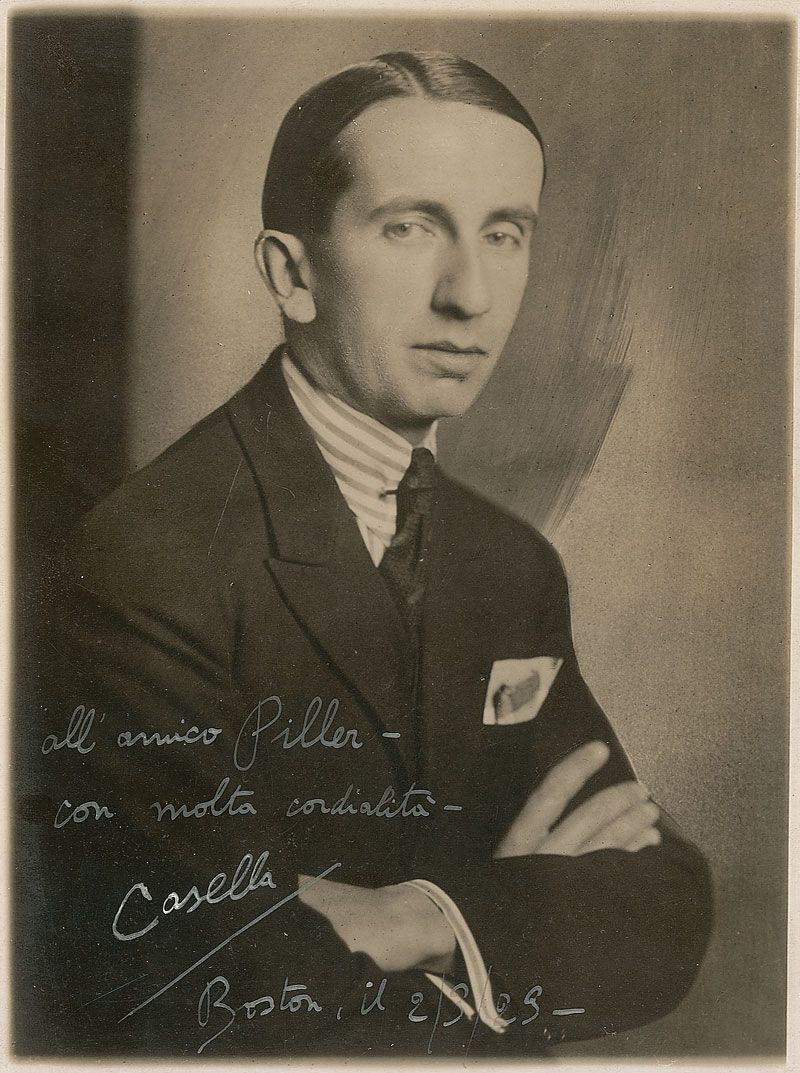 Italian composer of modernist tendencies (1883–1947) perhaps best known for his retrospective works, ‘Scarlattiana’ and ‘Paganiniani.’ Vintage 6 x 8 photo, inscribed in white ink, in Italian, and signed “Casella, Boston il 2/3/29.” In fine condition, with a bit of light contrast to date and location along bottom.