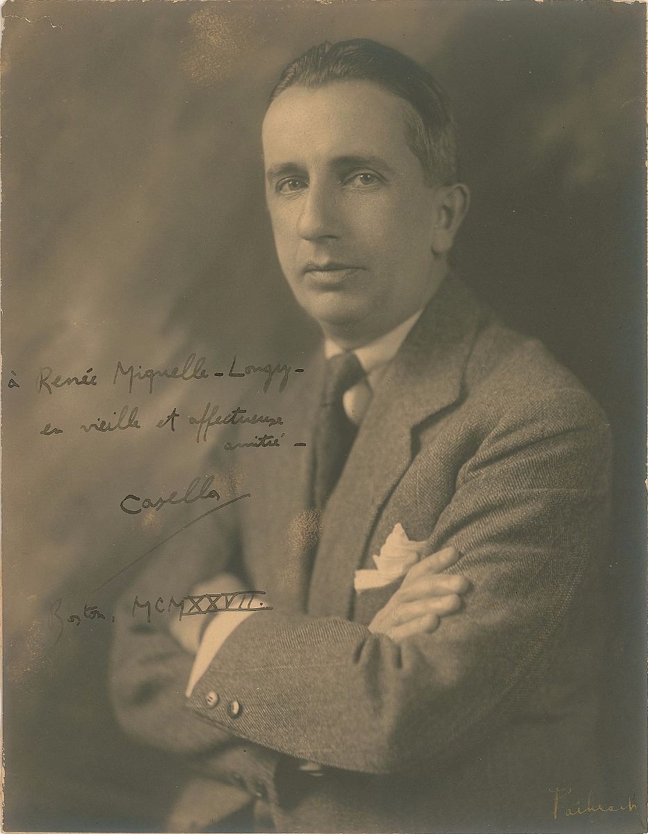 Italian composer of modernist tendencies (1883–1947) perhaps best known for his retrospective works, ‘Scarlattiana’ and ‘Paganiniani.’ Vintage matte-finish 7 x 9 portrait of Casella with his arms crossed, signed and inscribed in Italian in fountain pen, “Casella, Boston, MCMXXVII.” In fine condition, with a small tear to upper left corner.