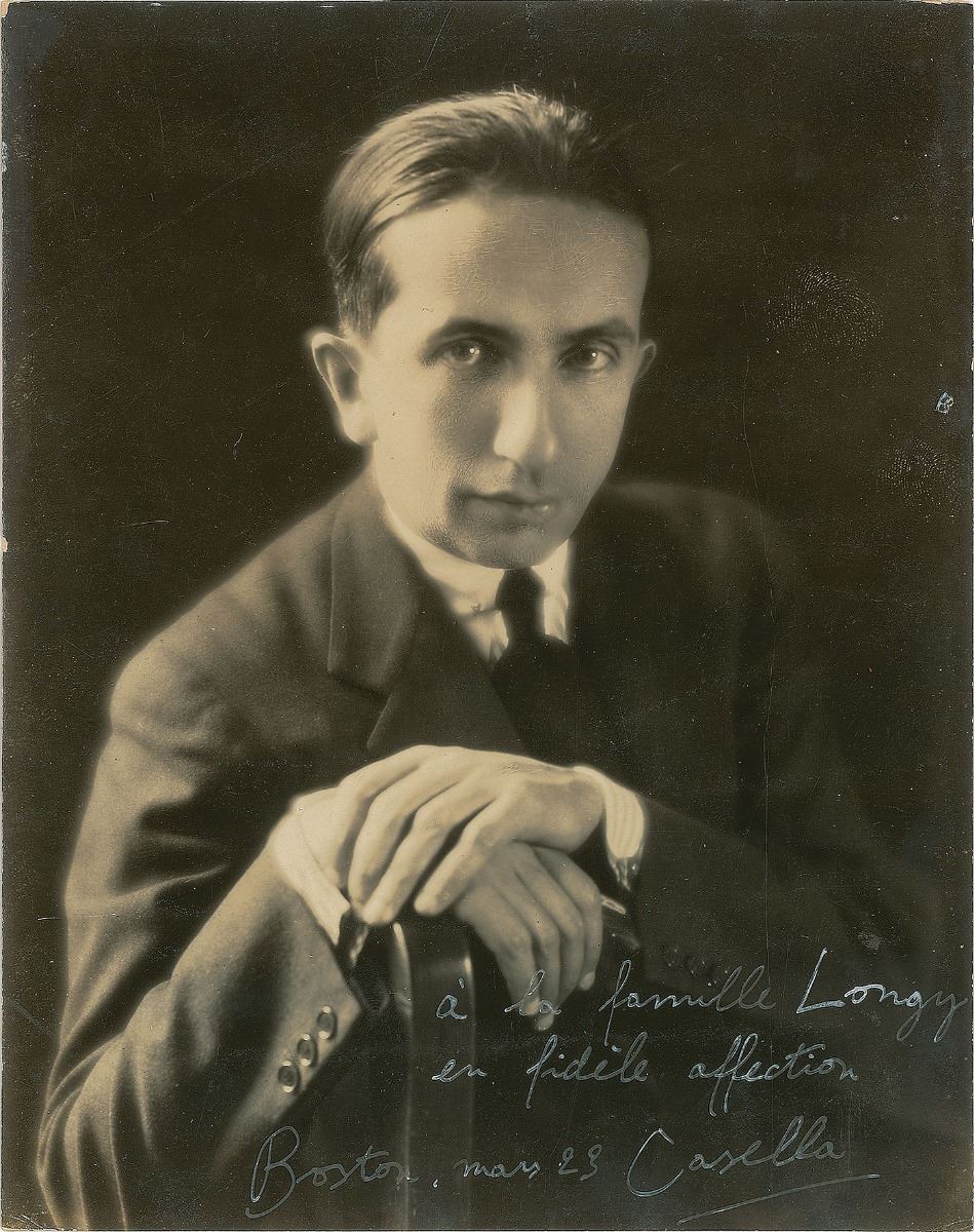 Italian composer of modernist tendencies (1883–1947) perhaps best known for his retrospective works, ‘Scarlattiana’ and ‘Paganiniani.’ Vintage semi–glossy 6.25 x 8 seated portrait of Casella by Marcia Stein, signed and inscribed in Italian in white ink, “Boston, May 23, Casella.” Reverse bears a photography credit stamp. In fine condition, with trimmed borders and light overall rippling.