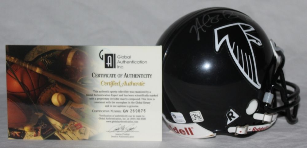 Riddell Falcons mini-helmet hand-signed in silver paint pen by Alge Crumpler. The autograph includes a Global Authentics (GA) hologram and matching COA for authenticity purposes.