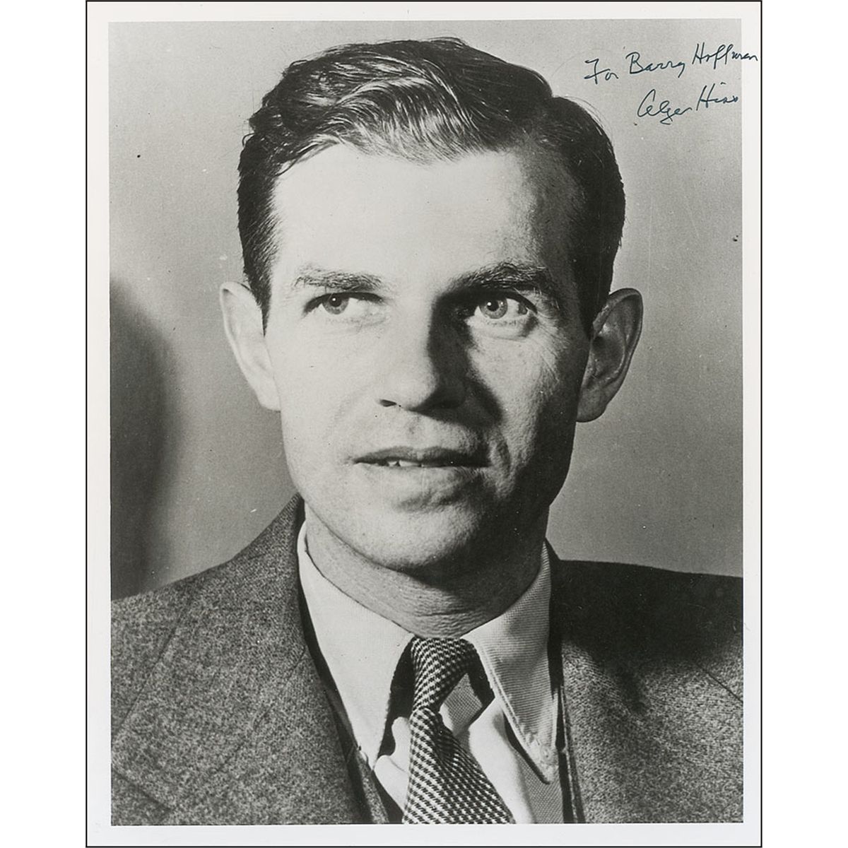 American lawyer, government official, author, and lecturer (1904–1996), famously accused of being a Soviet spy in 1948 and convicted of perjury in connection with this charge in 1950. Glossy 8 x 10 photo, a later copy of a press photo of Hiss at the height of his notoriety, signed and inscribed in person in black ink, “To Barry Hoffman, Alger Hiss.” In fine condition. This photo was acquired in-person during a luncheon with Hiss. After the collector presented the photos to sign, Hiss commented that he couldn’t remember signing photos of himself before. This photo represents one of the two we’ve ever seen; the other was acquired by the same collector at the same time.