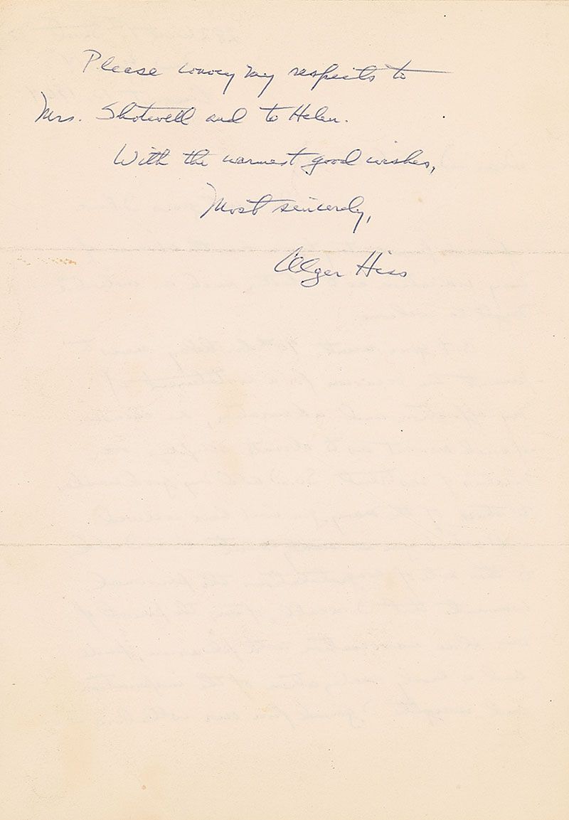 ALS, one page both sides, 6.75 x 9.75, August 10, 1964. Letter to historian James Shotwell. In part: “In recent years I have refrained from writing to you—in the absence of any indication as to whether such an initiative might be welcome. But your recent 90th birthday seems to present the occasion for a restatement of my affection and admiration, an occasion of such moment as to obviate scruples over niceties of restraint…I recall, often, the period of our close association with pleasure, pride and a lively realization of the inspiration and insights I gained from our collaboration.” In fine condition, with some scattered light toning.