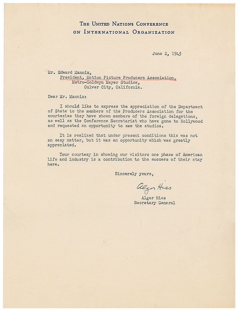 American lawyer, government official, author, and lecturer (1904–1996), famously accused of being a Soviet spy in 1948 and convicted of perjury in connection with this charge in 1950. TLS, one page, 8 x 10.5, United Nations Conference of International Organization letterhead, June 2, 1945. Letter to MGM executive Eddie Mannix. In part: “I should like to express the appreciation of the Department of State to the members of the Producers Association for the courtesies they have shown members of the foreign delegations…who have gone to Hollywood and requested an opportunity to see the studios…Your courtesy in showing our visitors one phase of American life and industry is a contribution to the success of their stay here.” In fine condition.