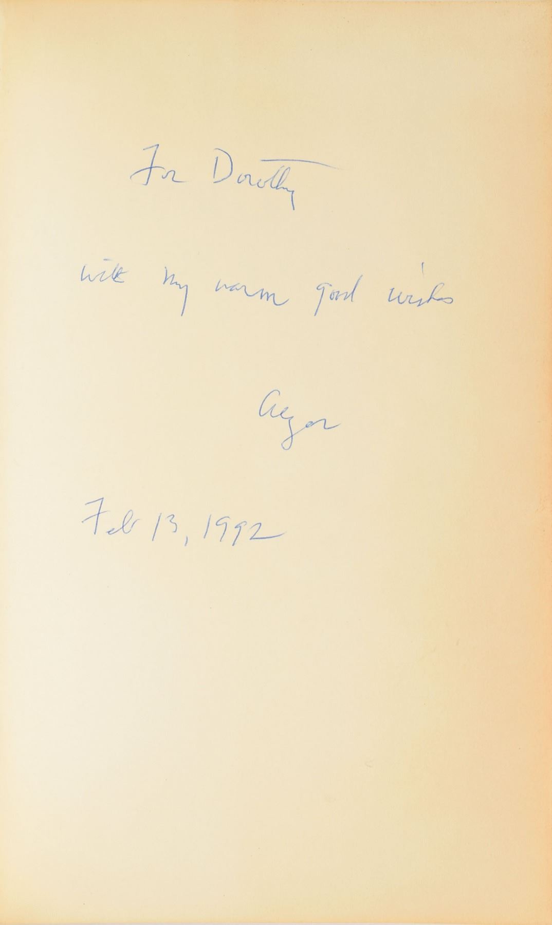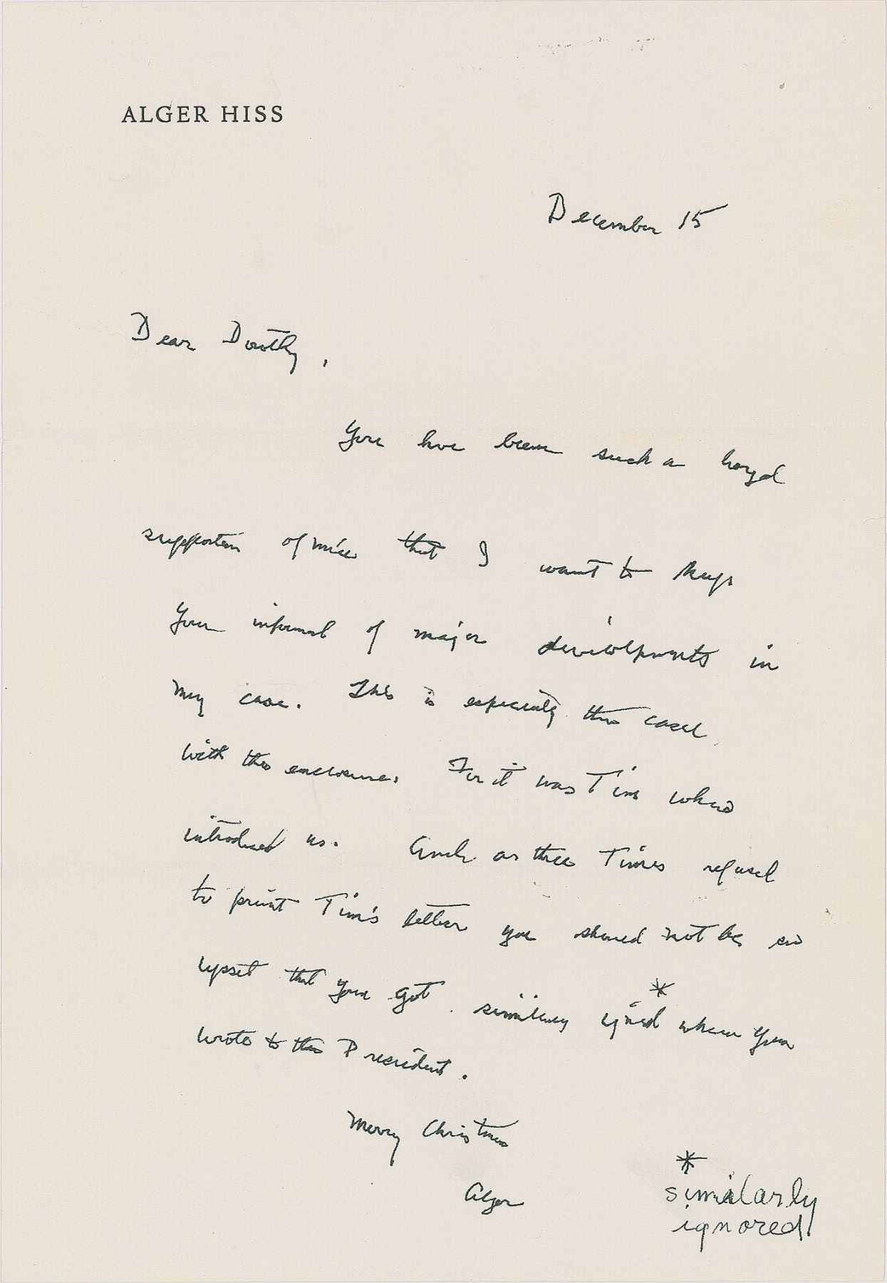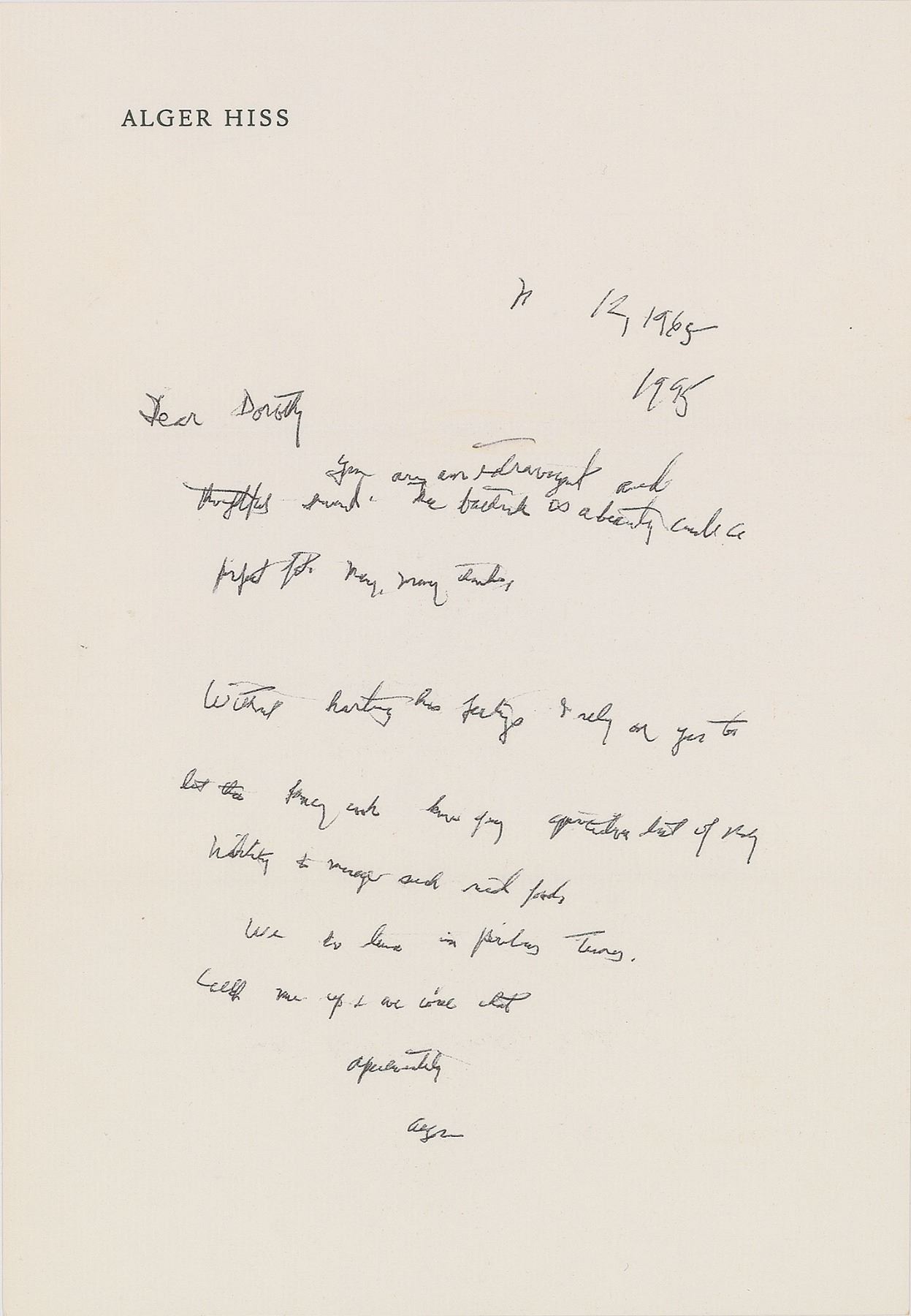 Signed book: Recollections of a Life. Later printing. NY: Seaver Books, 1988. Hardcover with dust jacket, 6.25 x 9.25, 240 pages. Signed and inscribed on the first free end page in blue ballpoint, "For Dorothy, with very warm good wishes, Alger, Feb. 13, 1992." Also includes two ALSs from Hiss, both signed "Alger," each with its original mailing envelope, postmarked 1995. In fine condition.