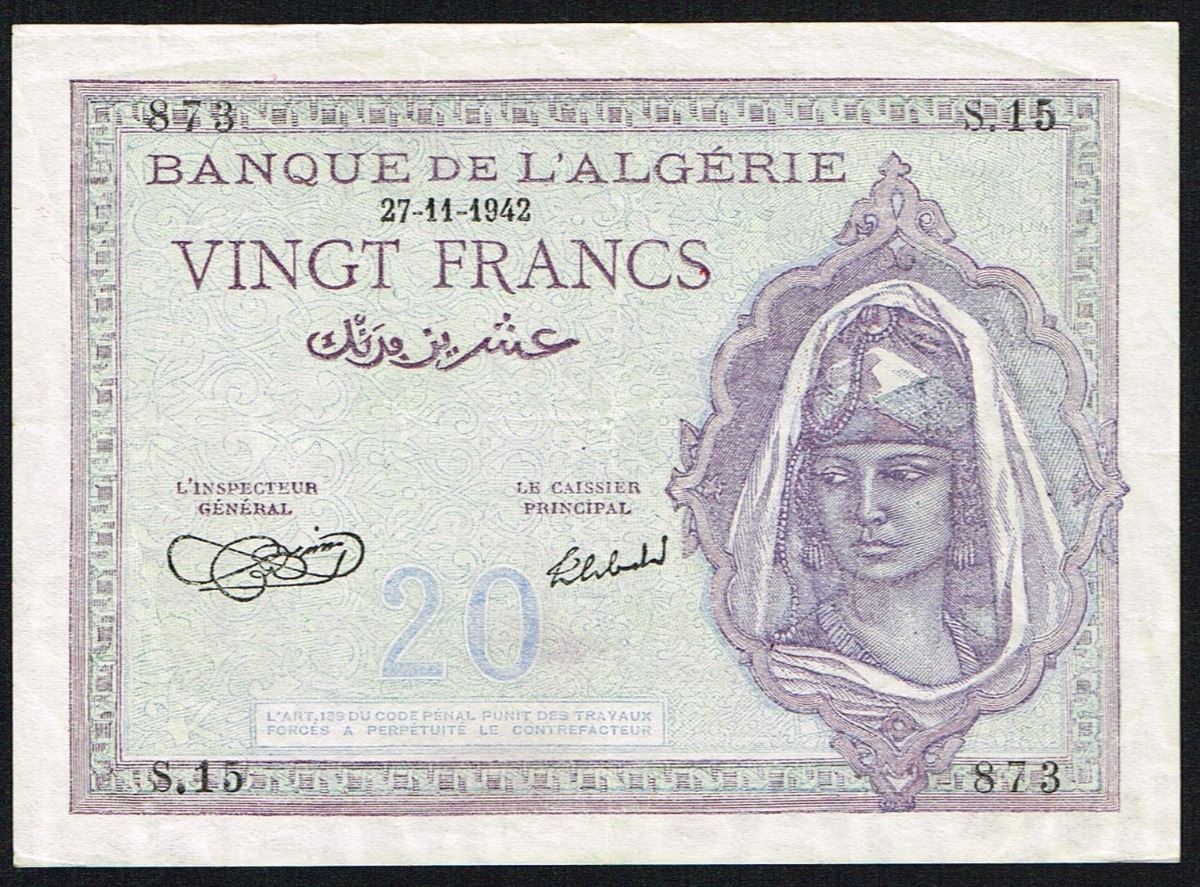 Algeria, 20 Francs, 1942-45, Pick# 92a, Banque De L'Algeria, SL# S.15 873, VF