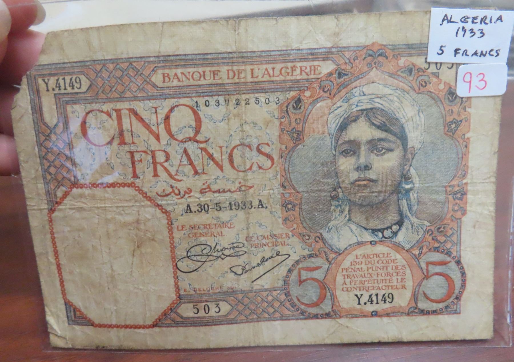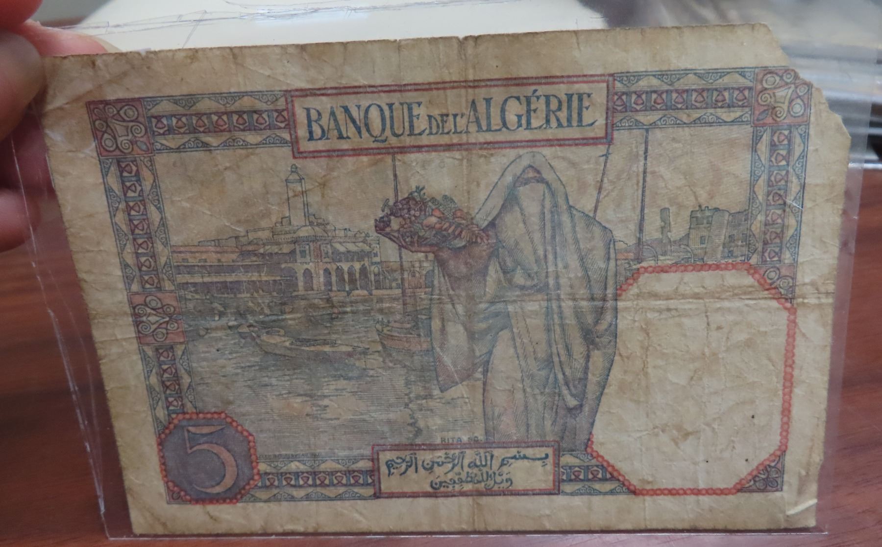 Algeria. Bank of Algeria. 1933 5 Francs. Fine with piece missing.