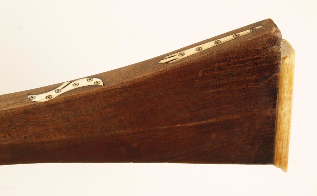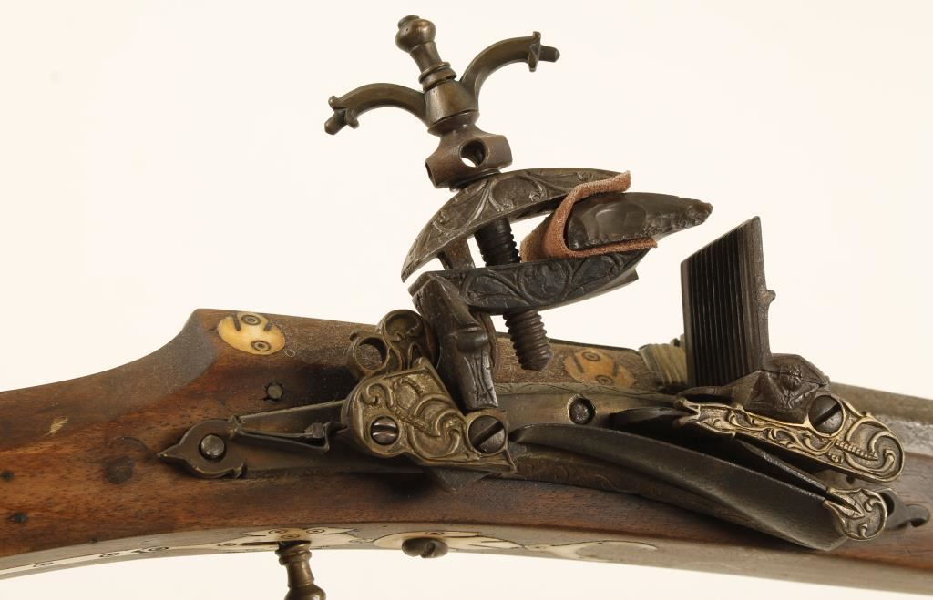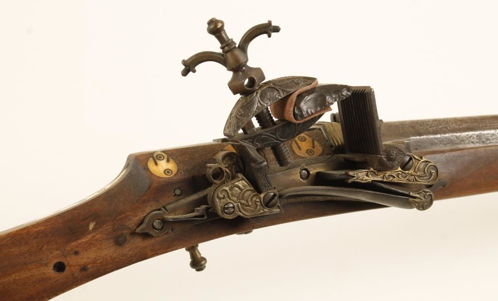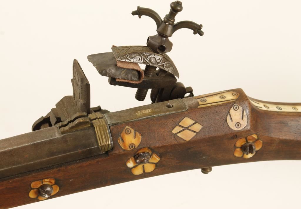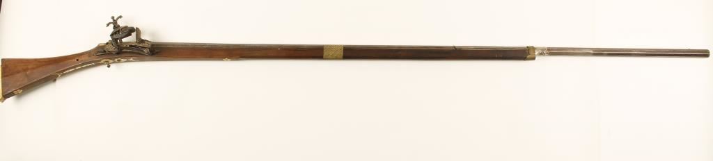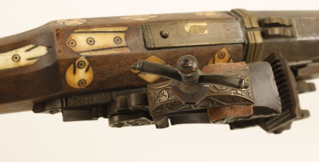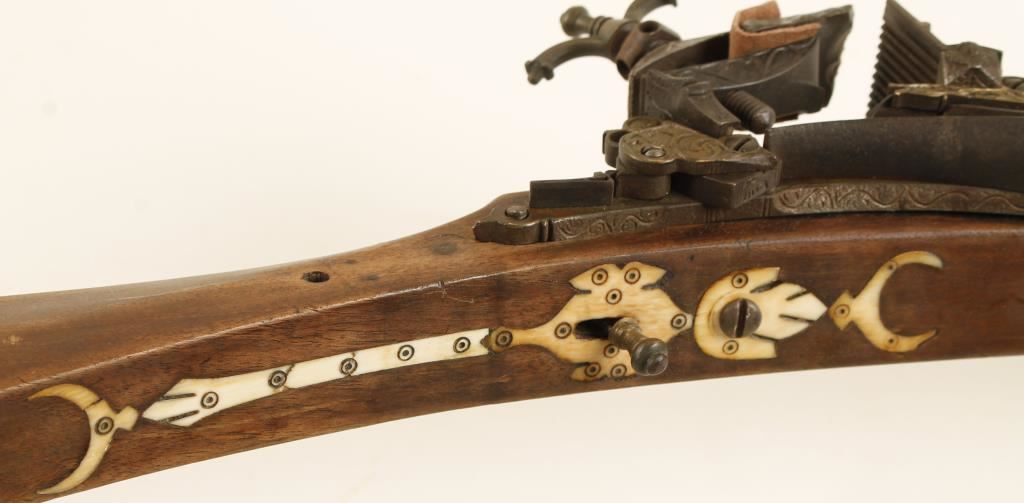 North African flintlock with a 56" octagon barrel. Steel is a brown patina with surface rust and edge wear. Brass lock plate is ornately but crudely engraved. Wood is cracked, dinged, scratched and scraped with 18" of the forend missing. Part of the buttplate is missing. The action doesn't work. The bore is rough and rusty. Condition is poor. *Antique Firearm*
