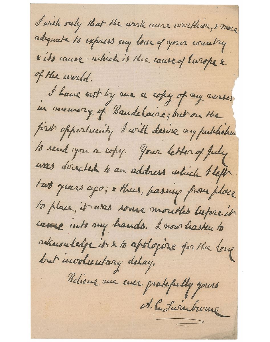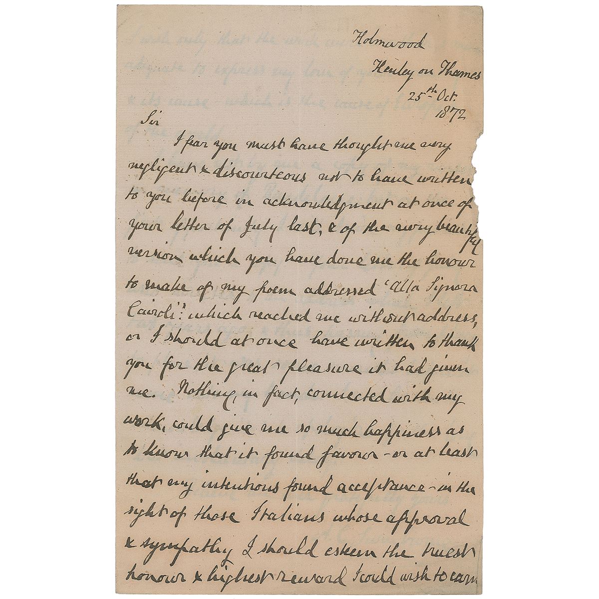 Important Victorian British poet (1837–1909) whose ‘decadent’ subject matter (including sadomasochism and lesbianism) made him one of the most controversial literary figures of his day. ALS signed “A. C. Swinburne,” two pages on two adjoining sheets, 5 x 8.25, October 25, 1872. Letter to the Italian poet P. G. Maggi. In part: "The very beautiful version which you have done me the honour to make of my poem addressed 'Alla Signora Carioli’…reached me without address, or I should at once have written to thank you for the great pleasure it had given me. Nothing, in fact, connected with my work, could give me so much happiness as to know that it found favour—or at least that my intentions found acceptance—in the sight of those Italians whose approval & sympathy I should esteem the truest honour & highest reward I could wish to earn. I wish only that the work were worthier, & more adequate to express my love of your country & its cause—which is the cause of Europe & of the world.—I have not by me a copy of my verses in memory of Baudelaire; but on the first opportunity I will desire my publisher to send you a copy.” In very good condition, with central vertical and horizontal folds, toning, and some paper loss to the right edge. Accompanied by a printed and manuscript copies of Maggi’s translation of ‘Alla Signora Cairoli,’ the latter likely in Maggi’s hand.