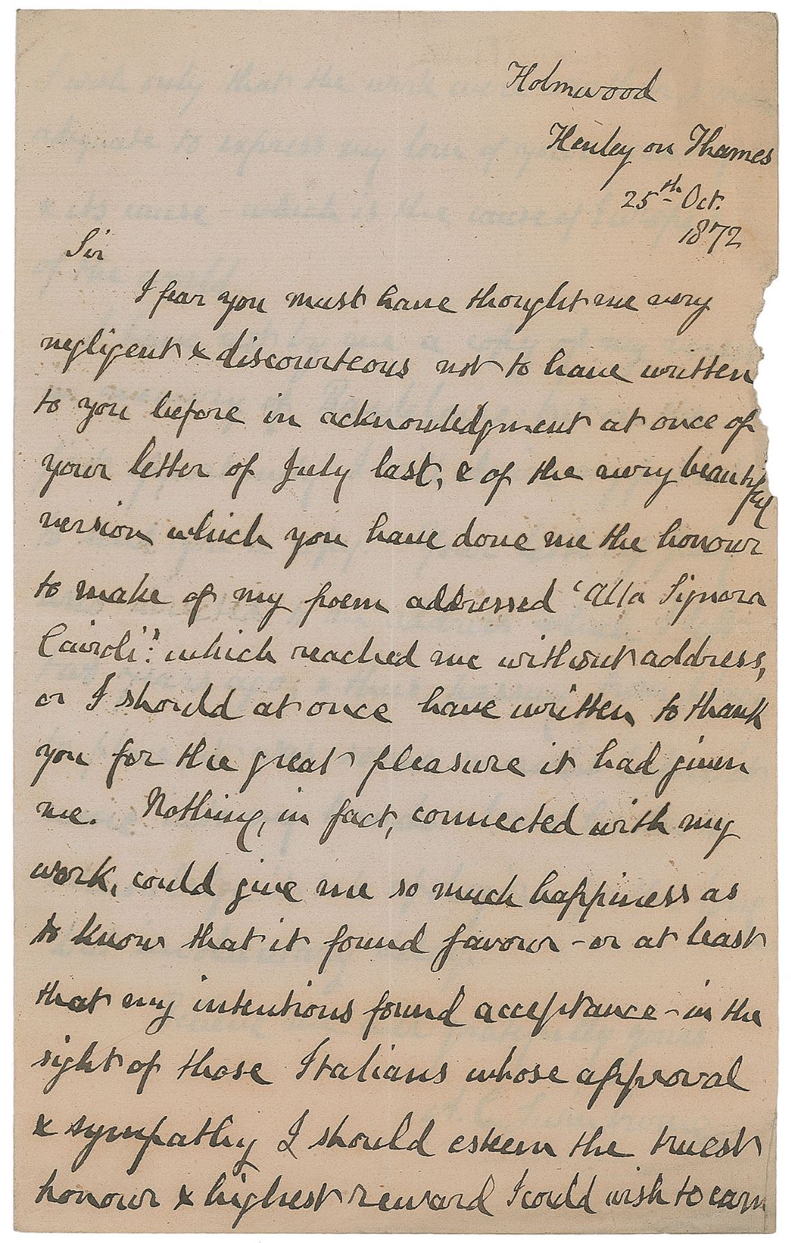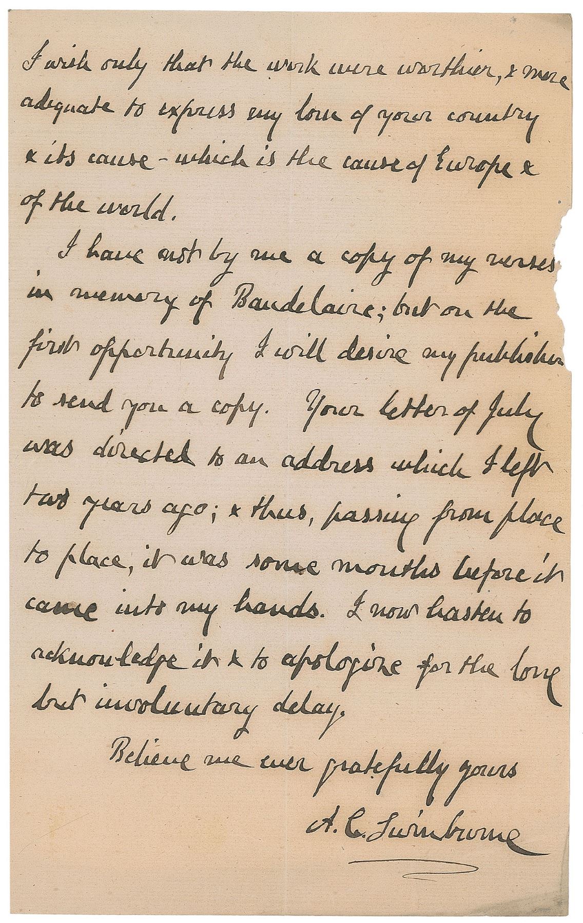 Important Victorian British poet (1837–1909) whose ‘decadent’ subject matter (including sadomasochism and lesbianism) made him one of the most controversial literary figures of his day. ALS signed “A. C. Swinburne,” two pages on two adjoining sheets, 5 x 8.25, October 25, 1872. Letter to the Italian poet P. G. Maggi. In part: "The very beautiful version which you have done me the honour to make of my poem addressed 'Alla Signora Carioli’…reached me without address, or I should at once have written to thank you for the great pleasure it had given me. Nothing, in fact, connected with my work, could give me so much happiness as to know that it found favour—or at least that my intentions found acceptance—in the sight of those Italians whose approval & sympathy I should esteem the truest honour & highest reward I could wish to earn. I wish only that the work were worthier, & more adequate to express my love of your country & its cause—which is the cause of Europe & of the world.—I have not by me a copy of my verses in memory of Baudelaire; but on the first opportunity I will desire my publisher to send you a copy.” In very good condition, with central vertical and horizontal folds, toning, and some paper loss to the right edge. Accompanied by a printed and manuscript copies of Maggi’s translation of ‘Alla Signora Cairoli,’ the latter likely in Maggi’s hand.