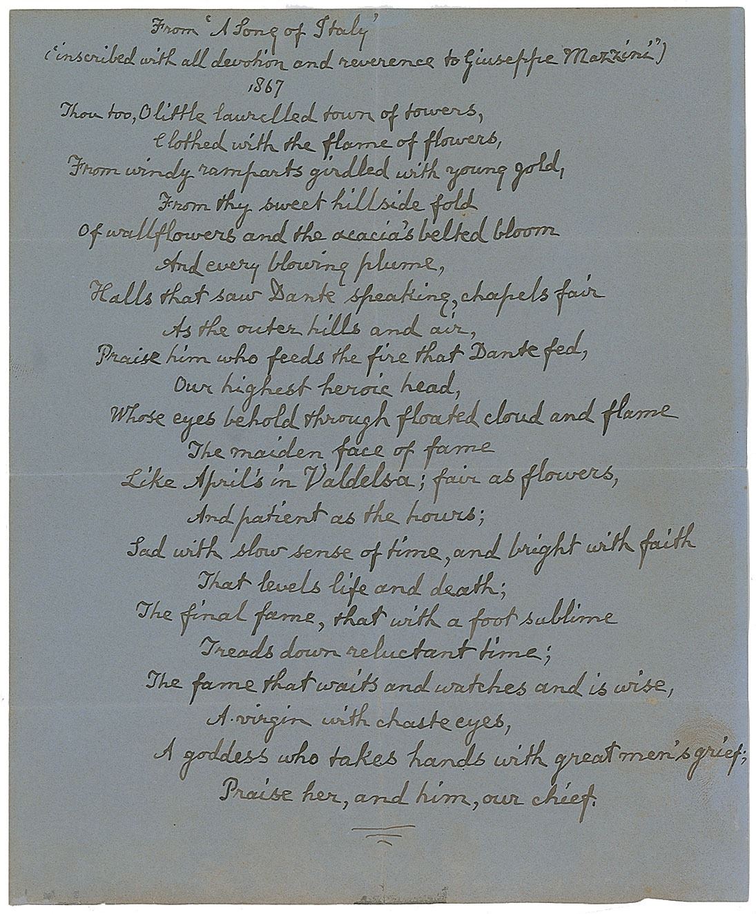 Important Victorian British poet (1837–1909) whose ‘decadent’ subject matter (including sadomasochism and lesbianism) made him one of the most controversial literary figures of his day. Wonderful handwritten quotation by Swinburne from "A Song of Italy," unsigned, one page, 8 x 9.75, headed: "From 'A Song of Italy,' ('inscribed with all devotion and reverence to Giuseppe Mazzini'), 1867." The piece concludes: "The final fame, that with a foot sublime / Treads down reluctant time; / The fame that waits and watches and is wise, / A virgin with chaste eyes, / A goddess who takes hands with great men's grief; / Praise her, and him, our chief." In very good to fine condition, with a light block of overall toning.