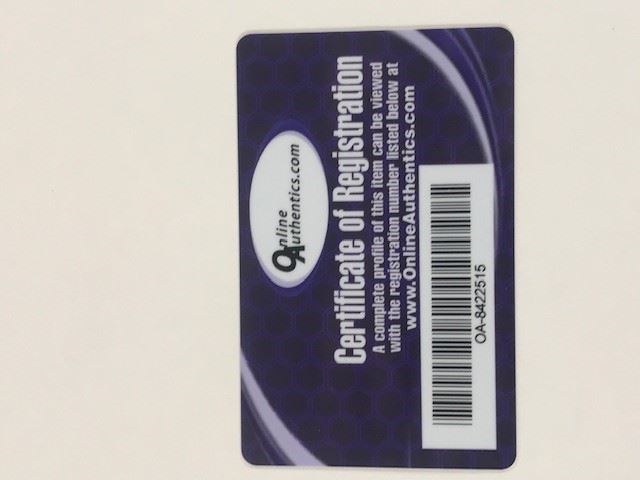 Regarding Memorabilia Items - All autographed memorabilia comes with a Certificate of Authenticity. FAA may have an interest in certain third-party authenticators and bidder hereby waives any potential conflicts therein related to FAA's relationship with such authenticators. FAA is not responsible for the opinions of any of the third-party authenticators. You should in no way rely exclusively on such third-party opinions without conducting your own due diligence prior to bidding. All Certificates of Authenticity may only be relied upon for one year from the date of sale of any item. FAA, and its consignors may be determined to be "Dealer(s)" within the meaning of California Civil Code Section 1739.7(a)(4) and as such make the following statement: SALE OF AUTOGRAPHED SPORTS MEMORABILIA: AS REQUIRED BY LAW, A DEALER WHO SELLS TO A CONSUMER ANY SPORTS MEMORABILIA DESCRIBED AS BEING AUOTOGRAPHED MUST PROVIDE A WRITTEN CERTIFICATE OF AUTHENTICITY AT THE TIME OF SALE. THIS DEALER MAY BE SURETY BONDED OR OTHERWISE INUSRED TO ENSURE THE AUTHENTICITY OF ANY COLLECTIBLE SOLD BY THIS DEALER.