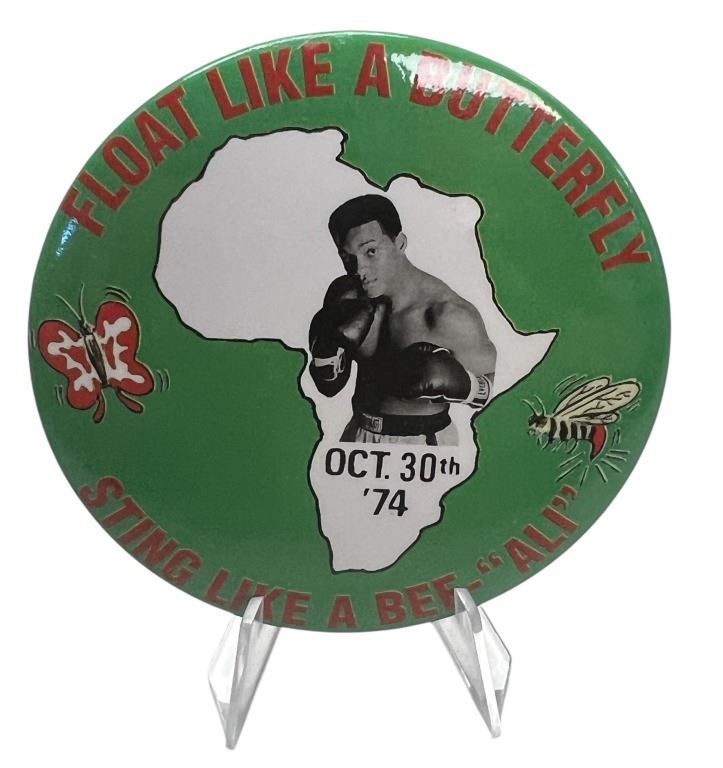 Original Ali boxing match badge worn by a fan in the Michael Mann directed biographical sports drama film 'Ali' (2001).
