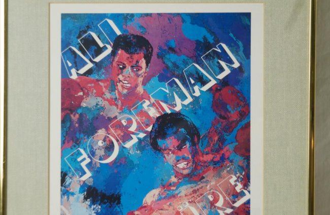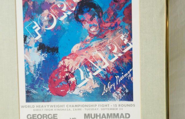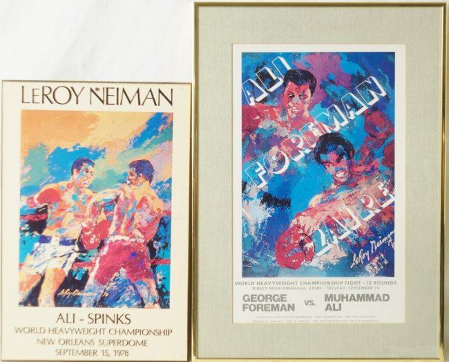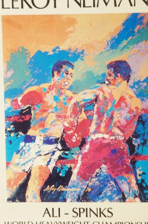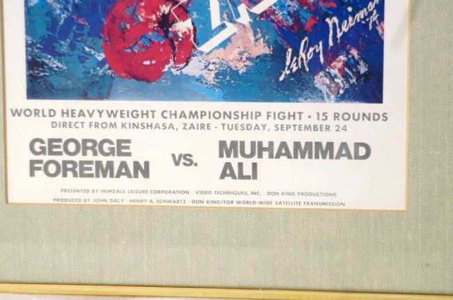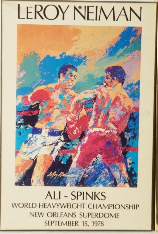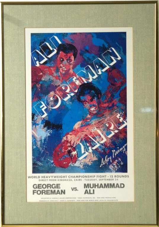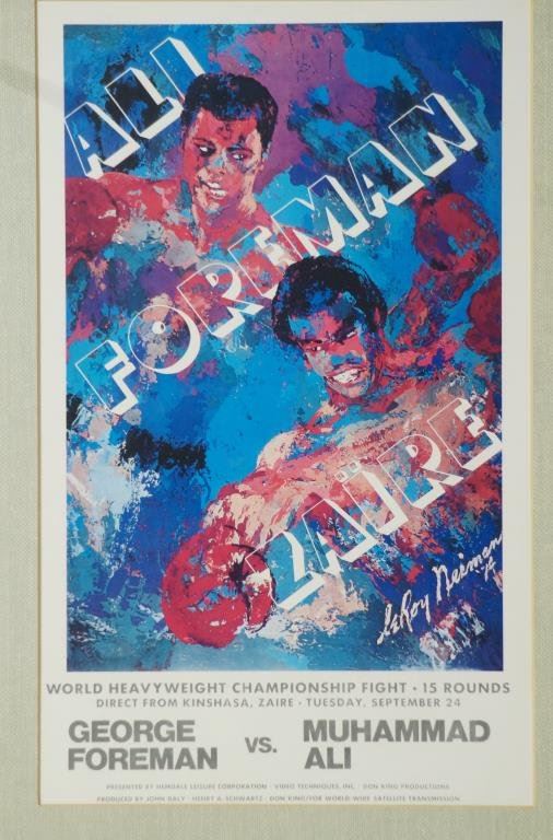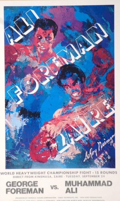 'The Rumble in the Jungle' Muhammad Ali vs. George Foreman Zaire World Heavyweight 2 posters: Championship Fight Original Boxing Poster by Leroy Neiman, not a reprint - measures 16.75" x 9.5". Plus 1978 Ali vs. Spinks Leroy Neiman Poster that has been laminated