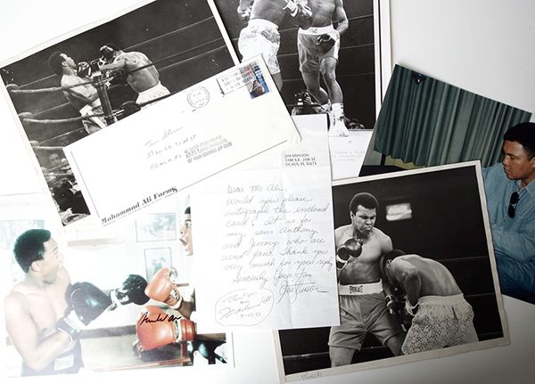 Ali, Muhammad. Request for an autograph which Ali obliged by writing in the lower left corner of the letter, "Thank you Jim / Muhammad Ali / 9-13-87." With an envelope from Muhammad Ali Farms, postmarked 13 Sep 1987 and addressed to Jim Stinson. Also in this lot: a color 8 x 10 in. photo of Ali clowning around with a sparring partner, signed "Muhammad Ali" across his left boxing glove; a color 8 x 10 in. photo showing Ali signing a poster; and three vintage photos from the March 9, 1971 Ali-Frasier "Fight of the Century" at Madison Square Garden. Frasier won a unanimous decision after 15 rounds, retaining the heavy-weight title and dealing Ali his first professional loss.