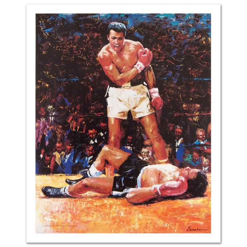 With bright colors that display movement and emotion, Igor Semeko capture's Ali's triumphant win in this expressive piece. "Ali Over Liston" is a fine art lithograph poster on paper. Measures approx. 26.5" x 32.5" (with border), 24" x 30" (image).