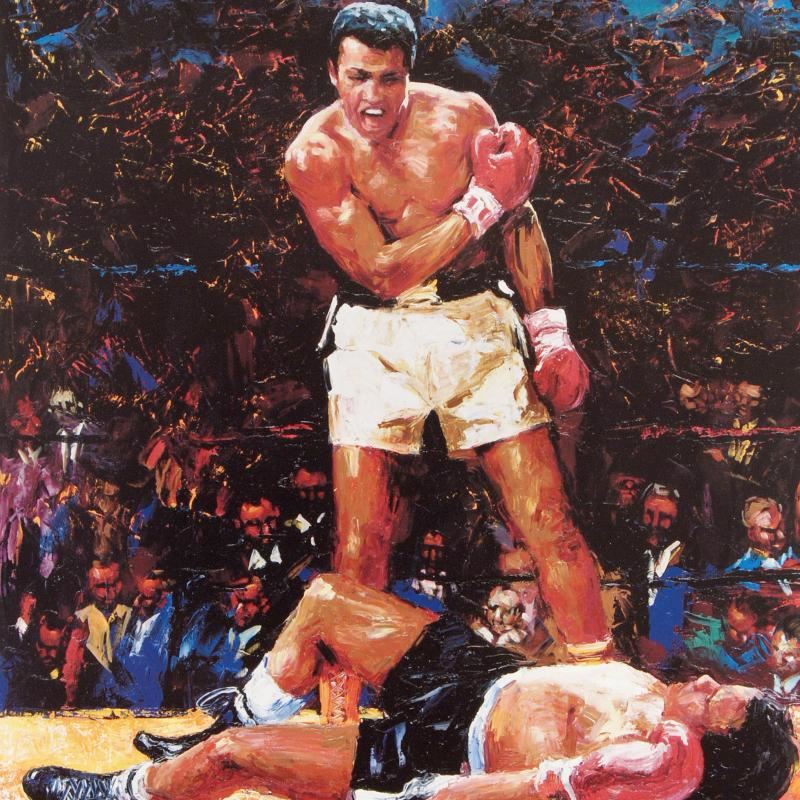 With bright colors that display movement and emotion, Igor Semeko capture's Ali's triumphant win in this expressive piece. "Ali Over Liston" is a fine art lithograph poster on paper. Measures approx. 26.5" x 32.5" (with border), 24" x 30" (image).