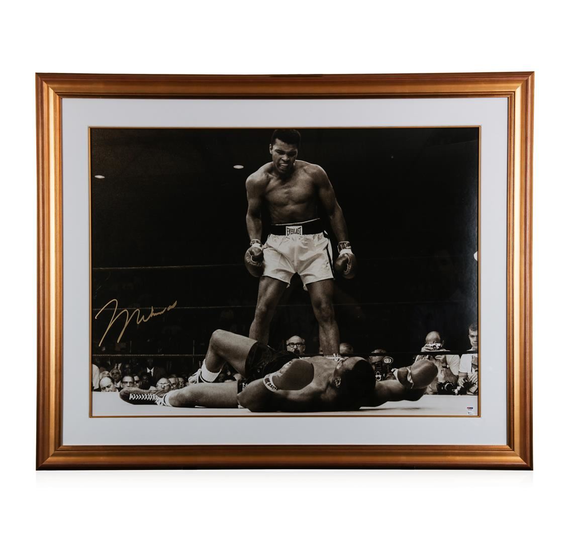 This large photograph is autographed by world famous boxer Muhammad Ali. The signature is PSA certified and has the sticker on the bottom left of the print. Neil Leifer was an aspiring young photographer when he went to Lewiston, Maine, to photograph the fight between Sonny Liston and the man then known as Cassius Clay. ... A case in point: his famous picture of Muhammad Ali standing over the fallen Sonny Liston in Lewiston, Maine, May 1965. Framed 40' x 50".