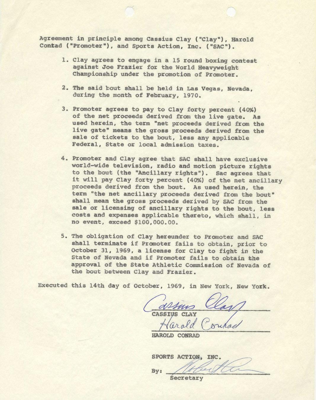 Scarce 1969 contract signed by Muhammad Ali for his scheduled comeback fight against Joe Frazier, dubbed the ''Fight of the Century.'' Single page ''Agreement in principle'' is signed in blue ink at the conclusion ''Cassius Clay'' and countersigned by promoter Harold Conrad and a representative for Sports Action Inc. which held media rights to the fight. Dated 14 October 1969 in New York, contract obligates Ali to fight 15 rounds with Frazier, to be held in Las Vegas in February 1970, with the condition of Conrad securing a license for Ali to fight in Nevada (which of course delayed the fight until 1971). Agreement also provides Ali with 40% of admission revenue and 40% of net proceeds from media rights. Contract is in near fine condition with a very minor crease to the upper left corner. Exceptional and rare, ideal for display.