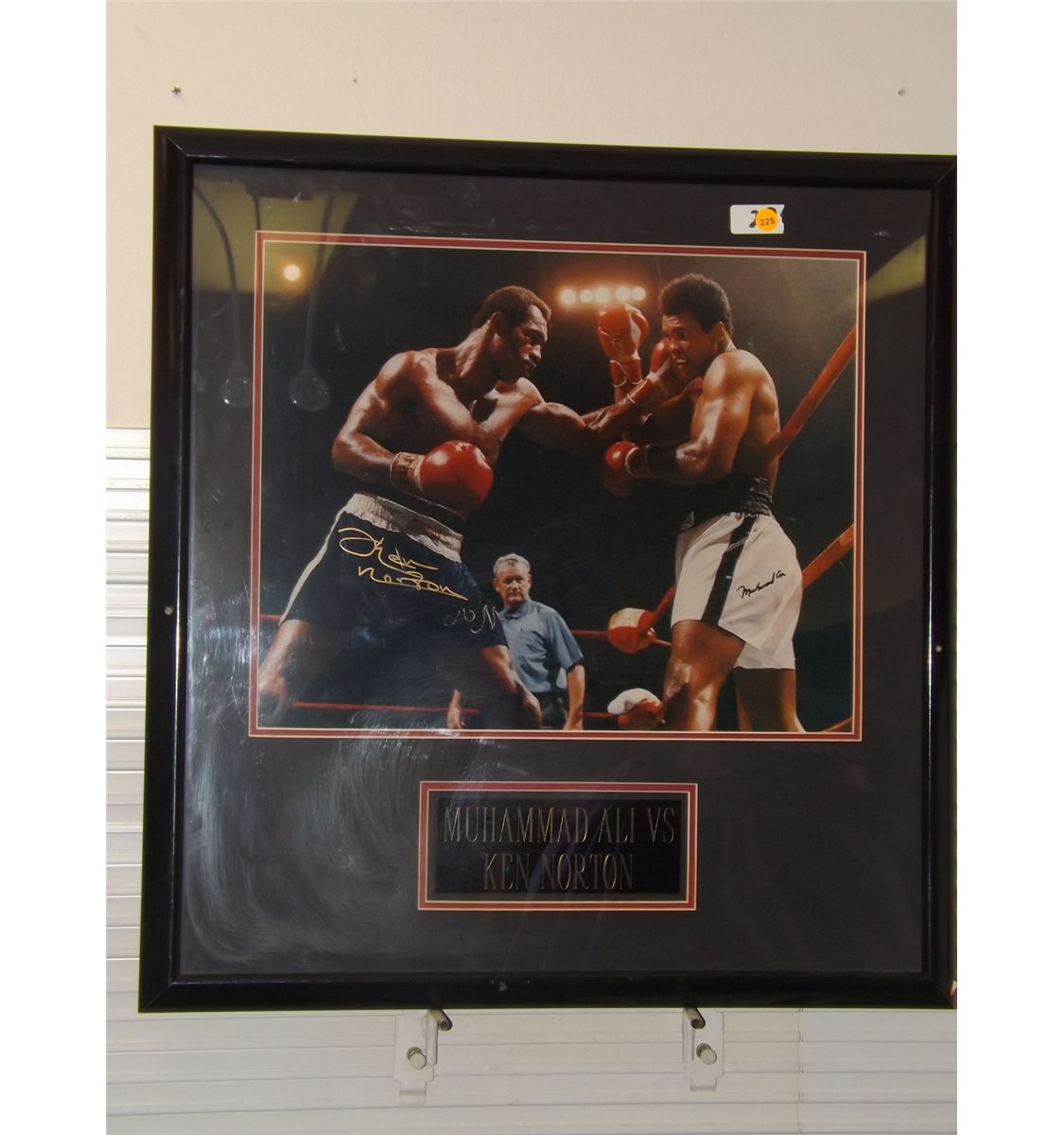 Ali vs. Norton Autographed Display. 28x28 Photo display. Autographed by Muhammad Ali & Ken Norton. Appraised or estimated retail value $2000. COA by Christopher Morales. All Sales Final. Please see terms and conditions of auction.