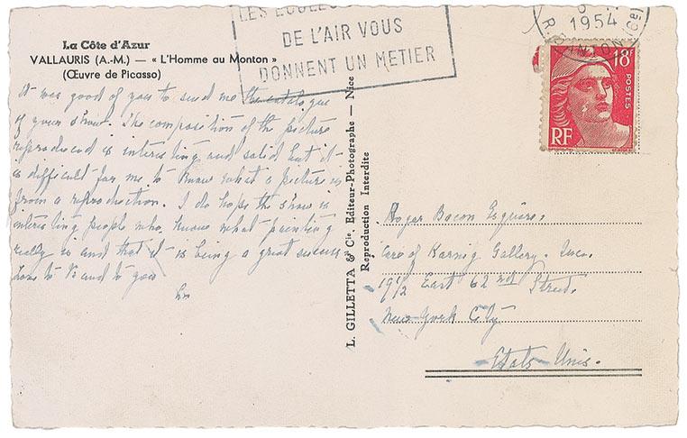 Companion of writer Gertrude Stein, who wrote about their life together in What Is Remembered and was the subject of Stein’s Autobiography of Alice B. Toklas. ALS signed “A,” on the correspondence side of a 5.25 x 3.25 postcard, no date, but postmarked 1954. Letter to artist Roger Bacon. In part: “It was good of you to send me the catalogue of your show. The composition of the picture reproduced is interesting and solid but it is difficult for me to know what a picture is from a reproduction. I do hope the show is interesting…” Toklas has also addressed the postcard to Bacon. In fine condition, with scattered light toning and soiling and postal mark over a couple words of text.