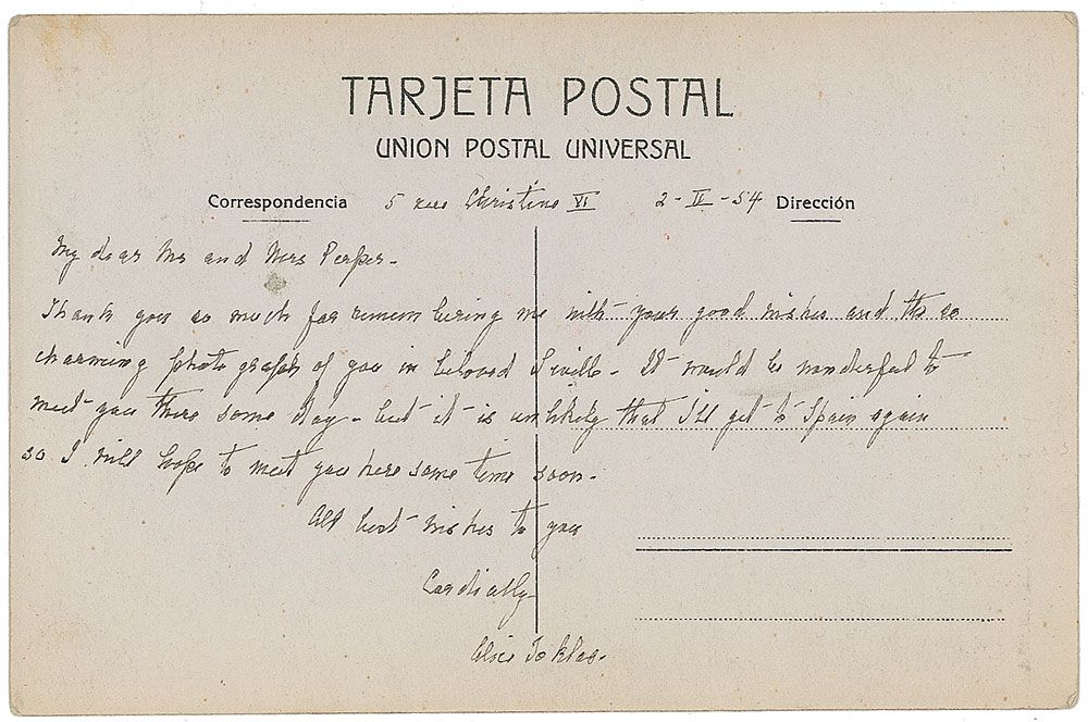 Companion of writer Gertrude Stein, who wrote about their life together in What Is Remembered and was the subject of Stein’s Autobiography of Alice B. Toklas (1877–1967). ALS signed “Alice Toklas,” one page on a postcard bearing an image of a matador, 5.5