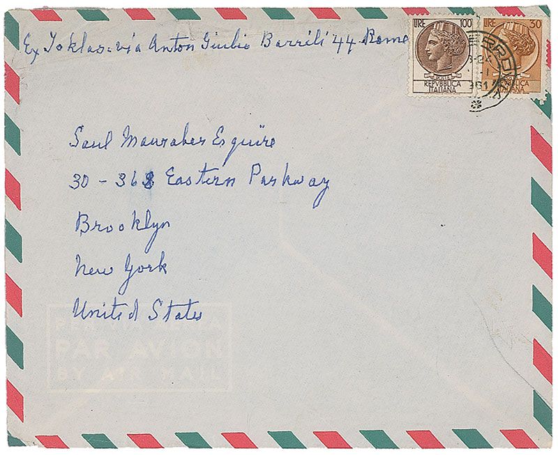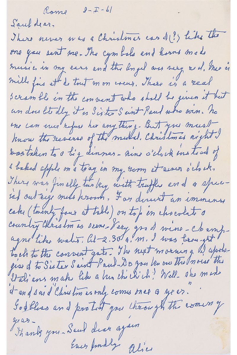 ALS signed “Alice,” one page, 5.5 x 9, January 8, 1961. Letter to Saul Mauraher. In part: “Christmas night was taken to a big dinner—nine o’clock instead of a baked apple on a tray in my room at seven o’clock. There was finally turkey with truffles…For dessert an immense cake (twenty-four) at table on top in chocolate a country Christmas scene. Very good wine—champagne like water. At 2.30 a.m. I was brought back to the convent gate. The next morning I apologized to Sister Saint Paul. Do you know the noise the Italians make like a hen chi chi chi? Well she made it an said ‘Christmas only comes once a year.’” In fine condition. Accompanied by the original mailing envelope, addressed by Toklas, and signed in the upper left corner in the return address area, “Ex. Toklas.”