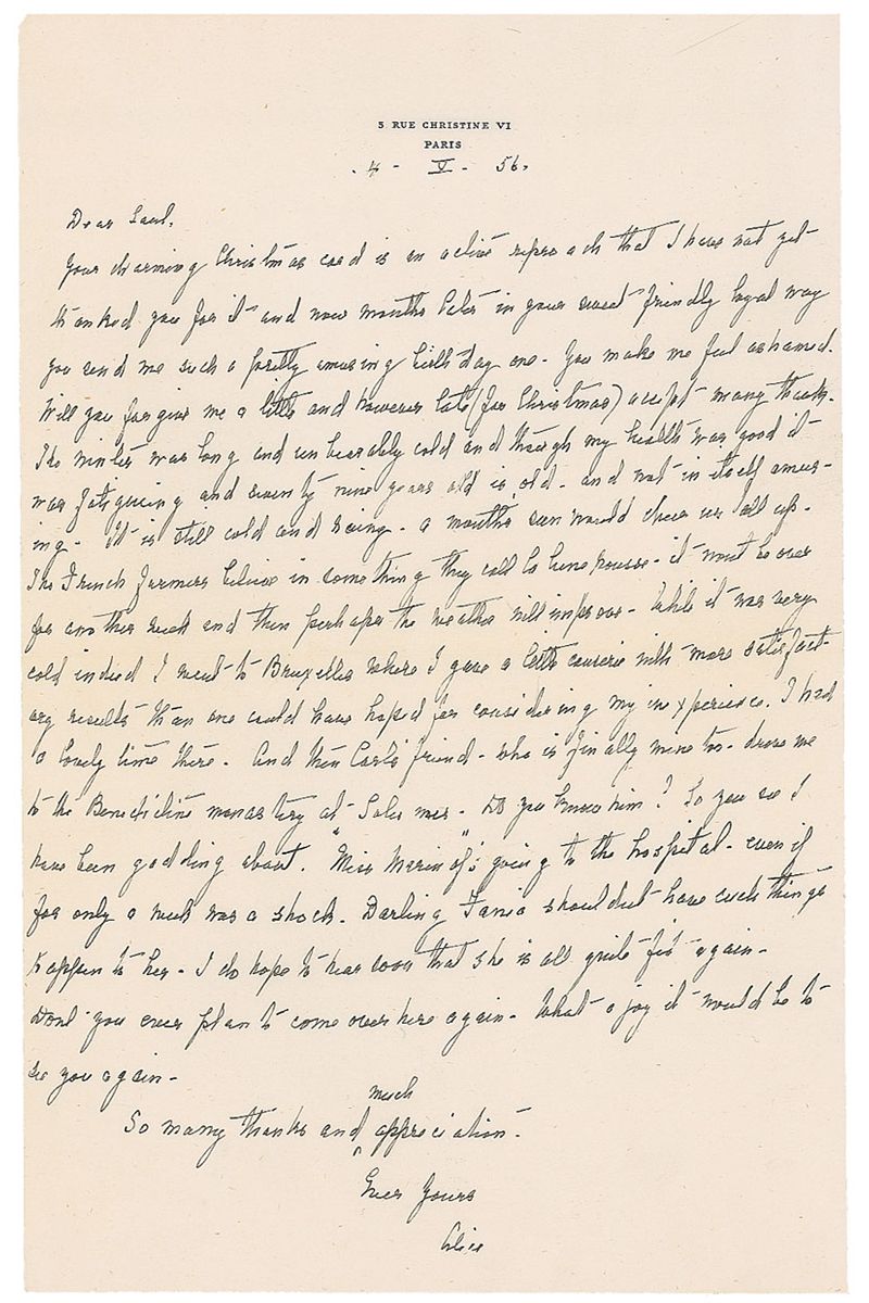 Companion of writer Gertrude Stein (1877–1967) who wrote about their life together in What Is Remembered. ALS signed “Alice,” one page, 5.25 x 8.25, May 4, 1956. Letter to Saul Mauraker sending thanks for a Christmas card. In part: “You send me such a pretty amusing holiday one—you make me feel ashamed. Will you forgive me a little and however late (for Christmas) accept many thanks. The winter was long and unbearably cold and though my health was good I was fast going on 79 years old…A month’s sun would cheer us all up…Miss Merin’s going to the hospital—even if for only a week was a shock.” In fine condition. Accompanied by the original mailing envelope addressed in Toklas’s hand.
