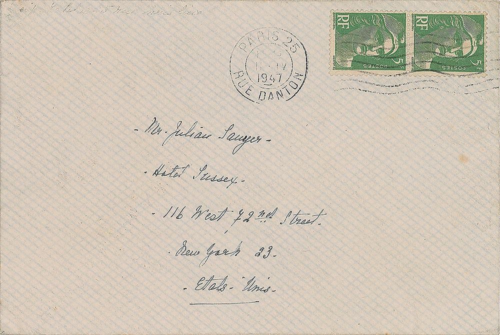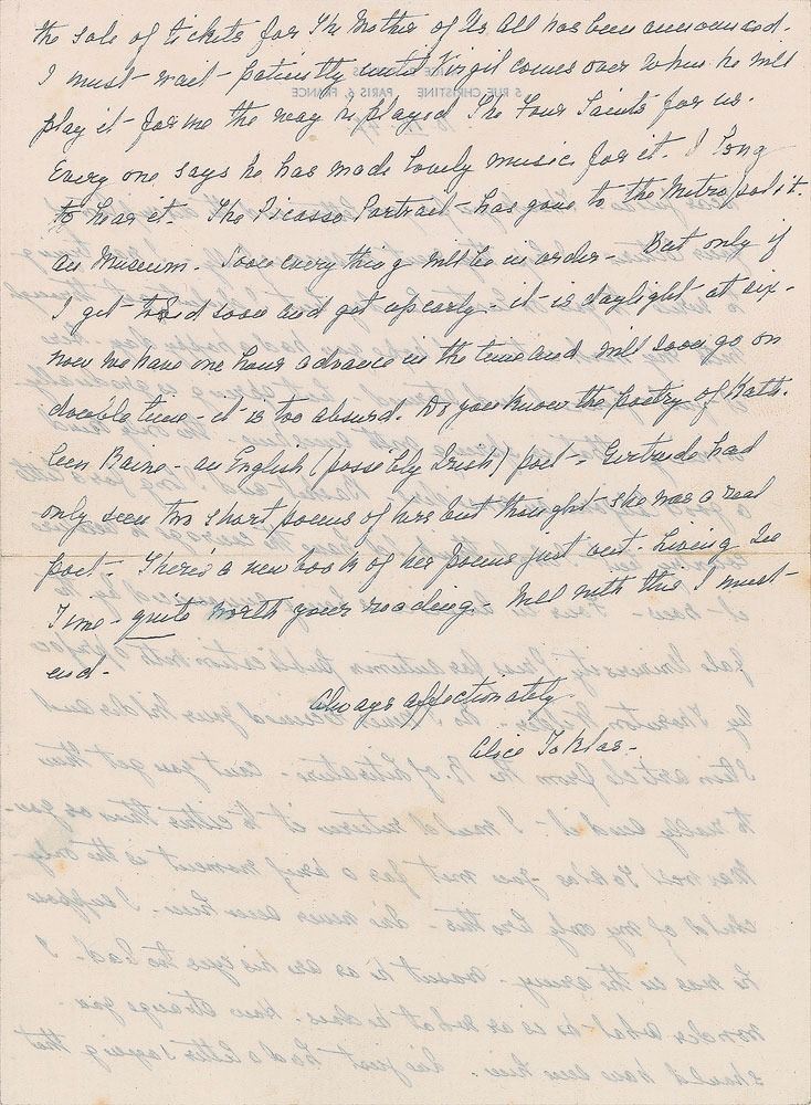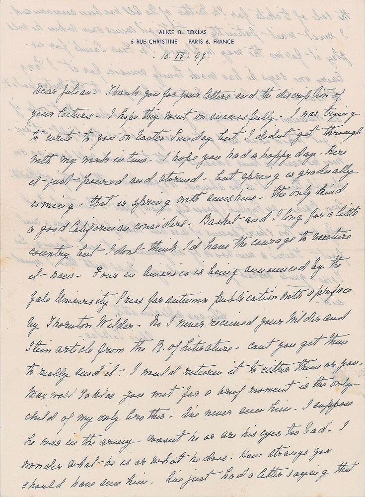 Companion of writer Gertrude Stein who wrote about their life together in What Is Remembered (1877–1967). ALS signed “Alice Toklas,” one page both sides, 5.75 x 7.75, personal letterhead, April 10, 1947. Letter to Julian Sawyer, in part: "Four in America is being announced by the Yale University Press for autumn publication with a preface by Thornton Wilder. No I never received your Wilder and Stein article from the R. of Literature. Can't you get them to really send it…I've just had a letter saying that the sale of tickets for The Mother of Us All has been announced. I must wait patiently until Virgil comes over when he will play it for me the way he played The Four Saints for us. Every one says he has made lovely music for it. I long to hear it. The Picasso portrait has gone to the Metropolitan Museum…Do you know the poetry of Kathleen Raine—an English (possibly Irish) poet—Gertrude had only seen two short poems of hers but thought she was a real poet. There's a new book of her poems just out." In fine condition. Accompanied by the original mailing envelope addressed in Toklas's hand. Upon her death in 1946, Gertude Stein bequest the 1905–06 portrait of her done by Pablo Picasso to the Metropolitan Museum in New York. A wonderful letter rife with arts world associations.