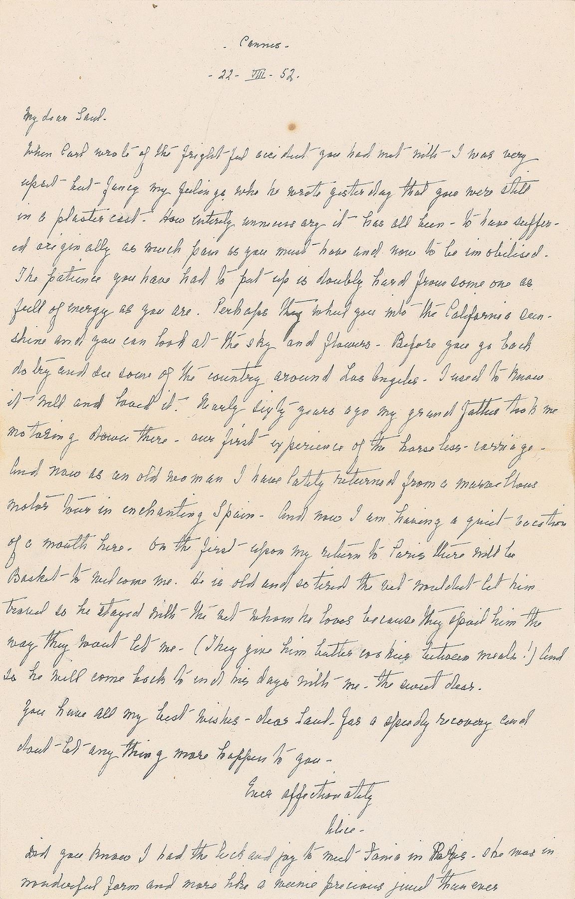 Companion of writer Gertrude Stein who wrote about their life together in What Is Remembered (1877–1967). ALS signed “Alice,” one page, 5.25 x 8.25, August 22, 1952. Letter to Saul Mauriber of Brooklyn, in part: "When Carl wrote of the frightful accident you had met with I was very upset but fancy my feelings when he wrote yesterday that you were still in a plaster cast. How entirely unnecessary it has all been—to have suffered originally as much pain as you must have and now to be imobilised…I have lately returned from a marvelous motor tour in enchanting Spain. And now I am having a quiet vacation month here." In fine condition.