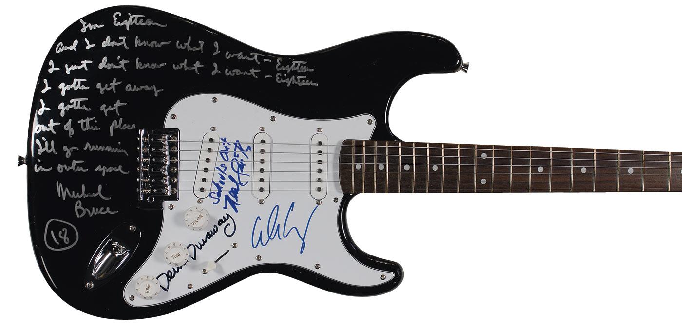 Black-bodied Stadium ‘stratocaster-style’ electric guitar, signed on the white pickguard in blue felt tip by Alice Cooper and Neil Smith, adding “School’s Out,” and in black felt tip by Dennis Dunaway, and signed on the body in silver ink by Michael Bruce, who adds a portion of the lyrics and chorus to the song ‘Eighteen.’ In fine condition. Oversized.