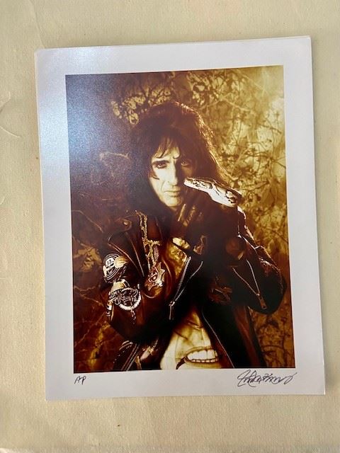 Hand-tinted 14x11 photograph of Alice Cooper portrait with a giant serpent by famed photographer Robert Knight, signed & numbered.