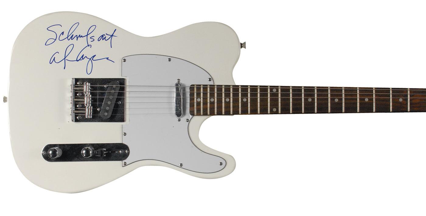 Cream-colored Stedman Pro ‘telecaster-style’ electric guitar, signed on the body in blue felt tip, “School’s Out, Alice Cooper.” In fine condition. Accompanied by a photo taken at time of signing. Oversized.