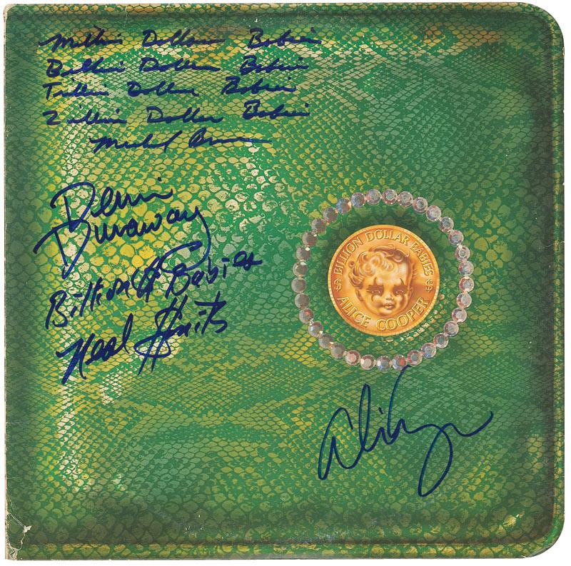 Billion Dollar Babies album signed on the front in blue tip by Alice Cooper, Michael Bruce, Dennis Dunaway, and Neil Smith. Michael Bruce, co-author of the title song also wrote, “Million Dollar Babies-Billion Dollar Babies-Trillion Dollar Babies-Zillion Dollar Babies.” In very good condition, with moderate wear to the edges, a mild tear to lower left corner on the front, and the slightest ‘ring of wear’ to the front. The record is included.