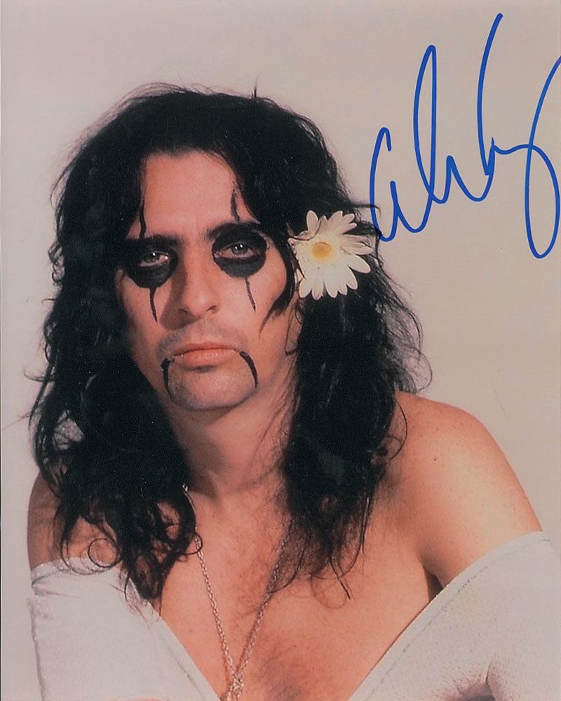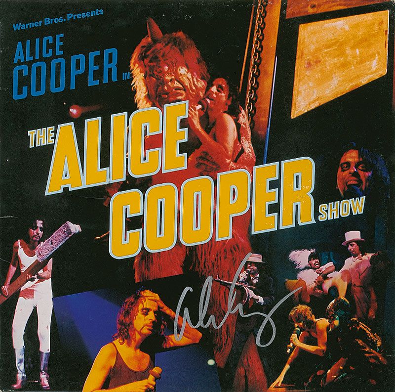 Two items: Alice Cooper Show album, signed on the front cover in silver ink. The record is included; and a satin-finish 8 x 10 photo of Cooper with a daisy in his hair, signed in blue felt tip. In fine condition.