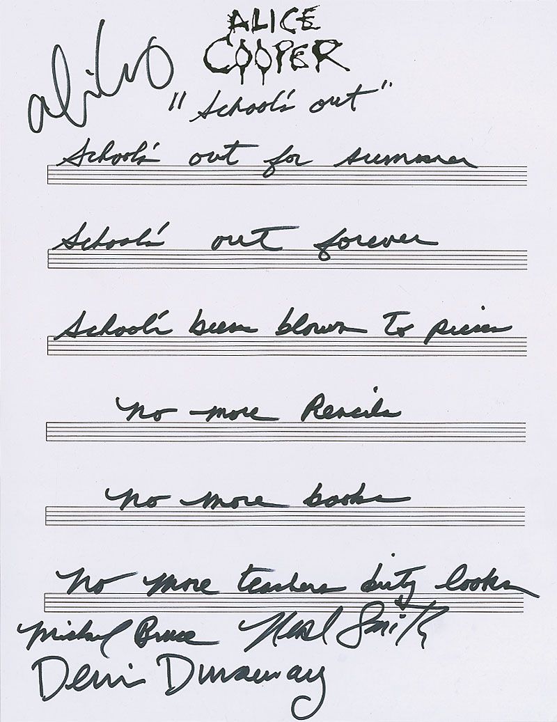 Souvenir handwritten lyrics to the chorus of ‘School’s Out,’ written out by co-writer Michael Bruce, on a white 8.5 x 11 sheet of musical manuscript paper, signed at the bottom by co-writer Michael Bruce, Dennis Dunaway, and Neal Smith, and signed at the top by Alice Cooper. In very fine condition.