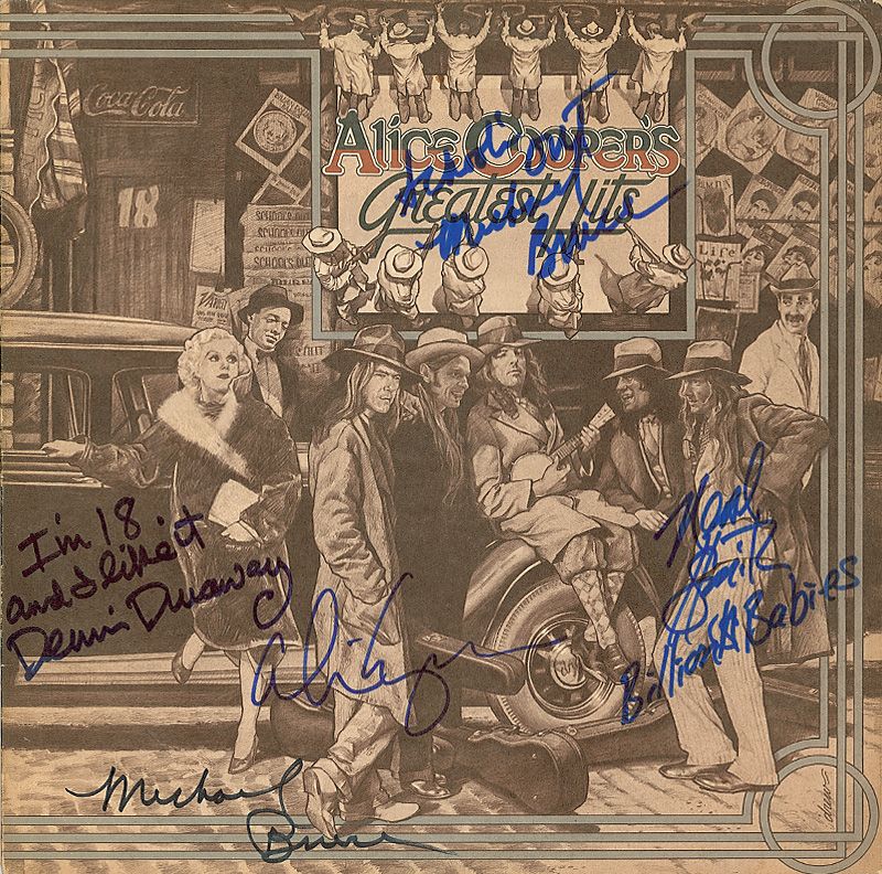 Alice Cooper’s Greatest Hits album signed on the front cover in blue and black felt tip by Alice Cooper, Neil Smith, adding “Billion Dollar Babies”; Michael Bruce (2), once adding “School’s Out”; and Dennis Dunaway, adding “I’m 18 and I like it.” In fine condition. The record is not included.