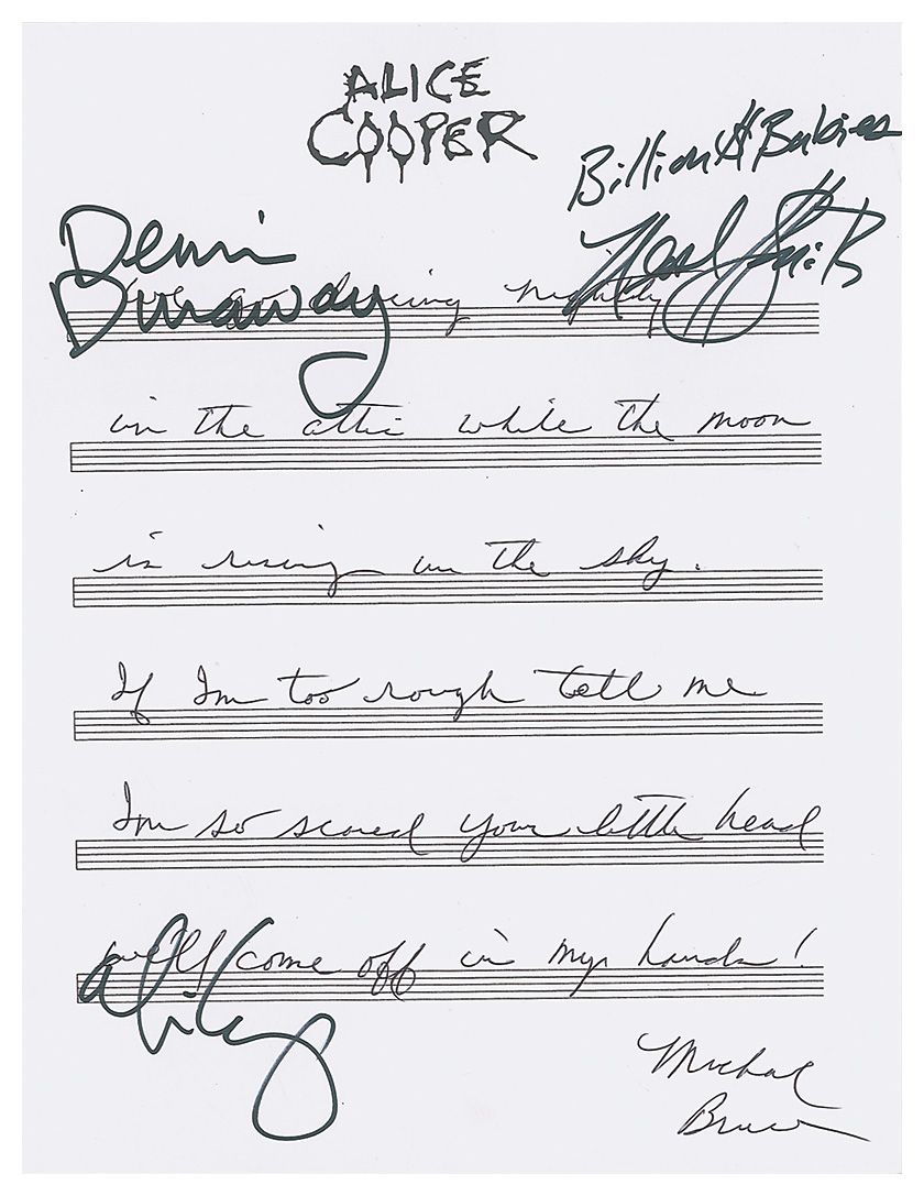 Souvenir handwritten lyrics to part of ‘Billion Dollar Babies,’ written out by co-writer Michael Bruce, on a white 8.5 x 11 sheet of musical manuscript paper, signed by Michael Bruce, Dennis Dunaway, and Neal Smith, and Alice Cooper. In very fine condition.
