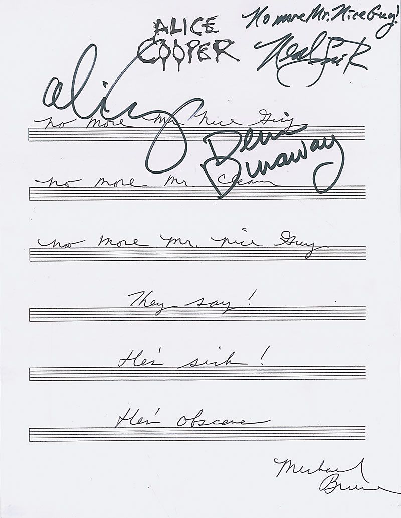 Souvenir handwritten lyrics to part of ‘No More Mr. Nice Guy,’ written out by co-writer Michael Bruce, on a white 8.5 x 11 sheet of musically-lined paper, signed in black felt tip and ballpoint by Alice Cooper, Michael Bruce, Dennis Dunaway, and Neal Smit