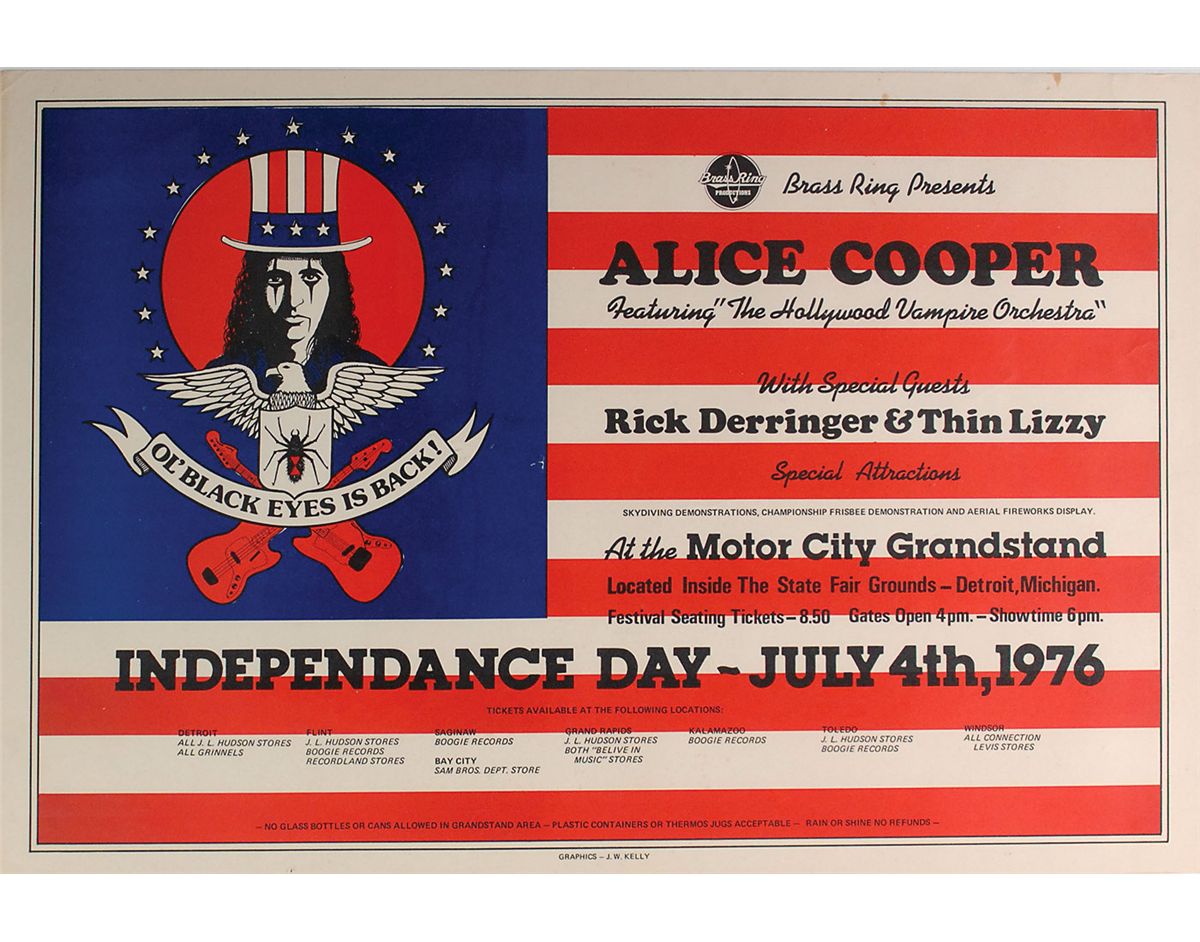 Original red, white, and blue promotional poster for Cooper’s July 4, 1976, concert at the Motor City Grandstand at the State Fair Grounds in Detroit. Poster measures 21 x 14, features an image of Cooper, and also lists Rick Derringer and Thin Lizzy on the bill. In fine condition. Rolled. Unfortunately shortly before rehearsals were set to start, Alice collapsed and was diagnosed as suffering from anemia and the tour was cancelled.